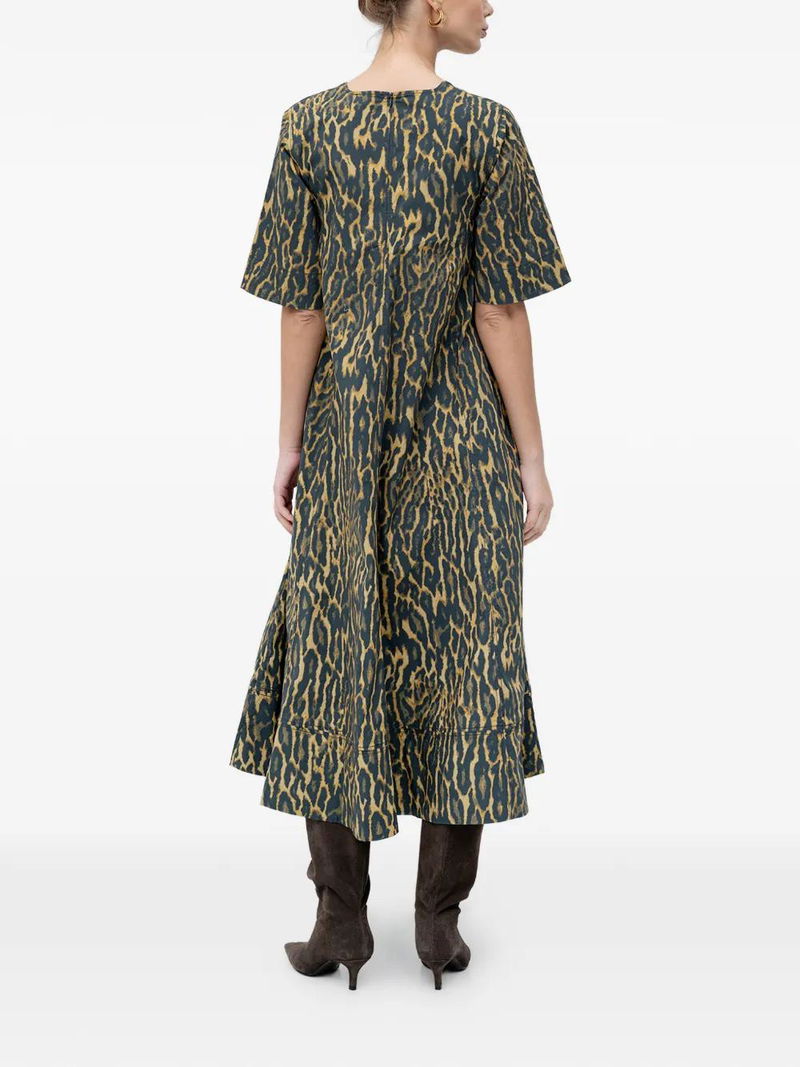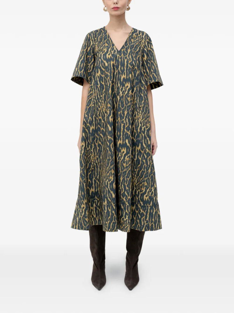 Yellow patterned V-neck short sleeves midi-length.