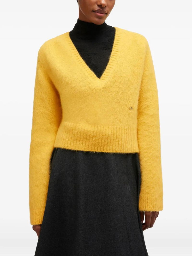 Yellow V-neck ribbed hem and cuffs long sleeves logo detail.