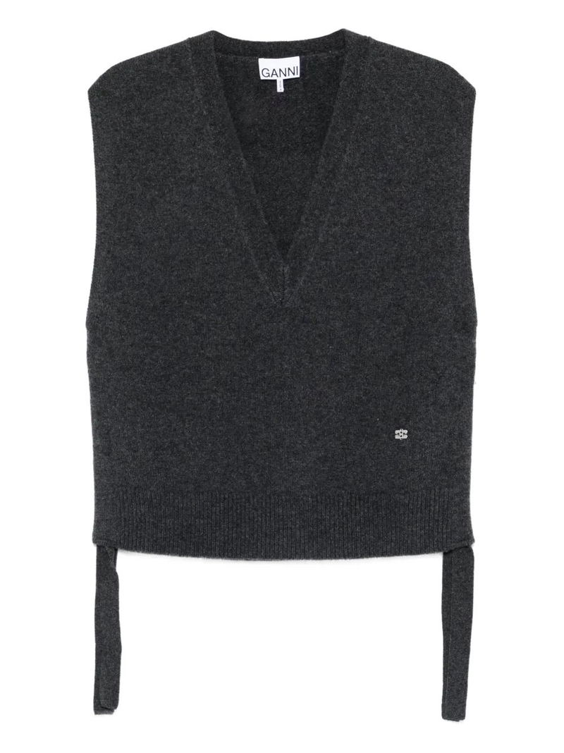 Phantom grey, V-neck, sleeveless, ribbed hem, side tie detail.