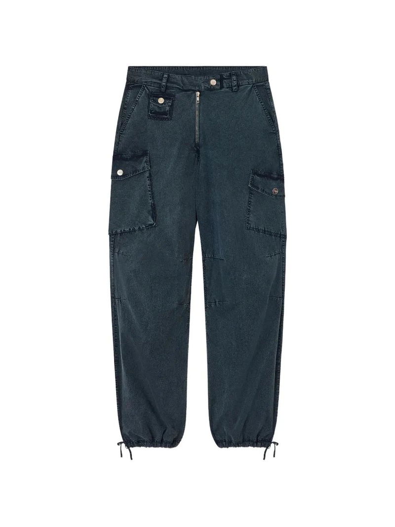 Dark blue button and zip fastening drawstring hem multiple cargo pockets seam detailing washed effect.