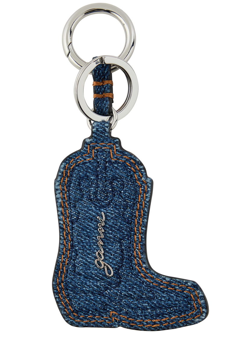 GANNI denim keyring. Western boot design, logo plaque, designer stamped, concentric contrast stitching, designer engraved. Ring clip-closure fastening.