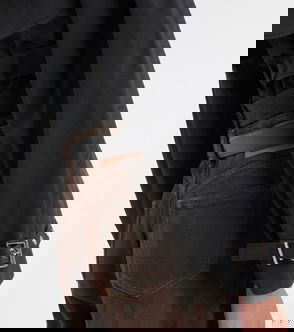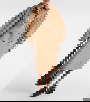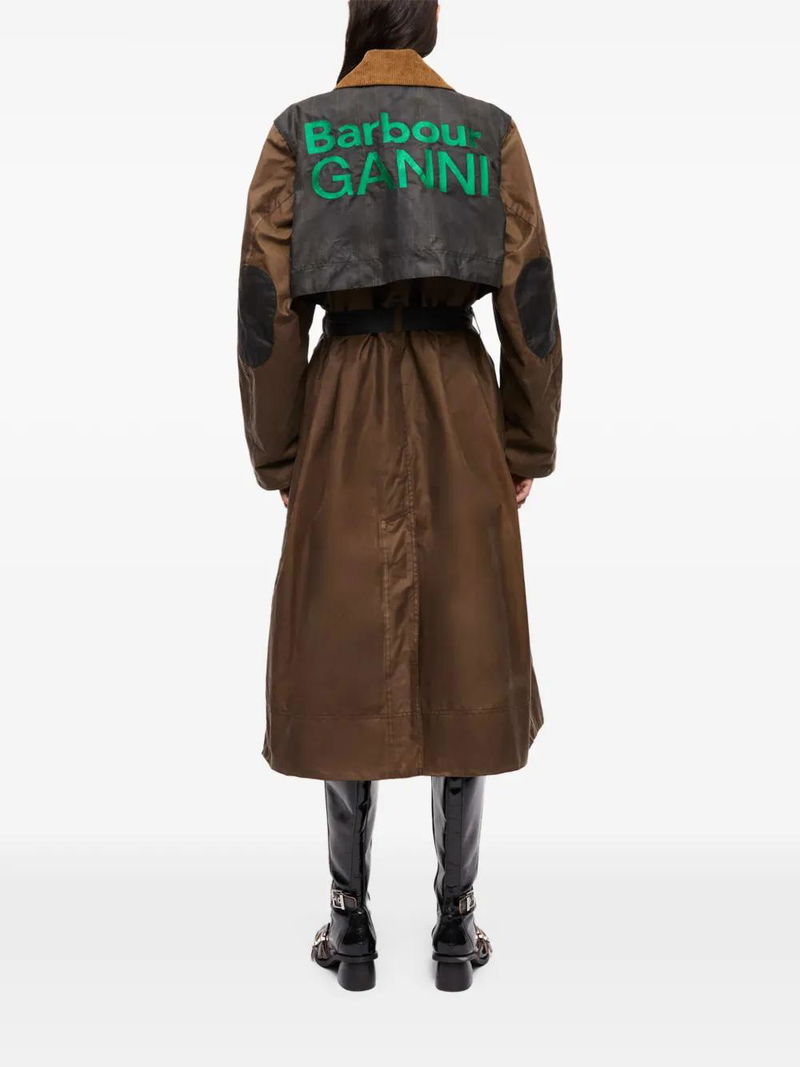 Brown corduroy collar button fastening logo patch belted double-breasted.