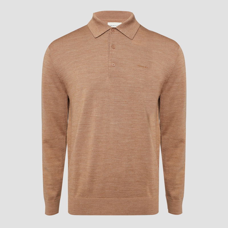 Mens Gant Extrafine Merino Wool Polo Shirt in beige. Flat-knit collar. Three button placket. Ribbed detailing at the hem and cuffs. GANT logo embroidered at the chest. Regular fit.