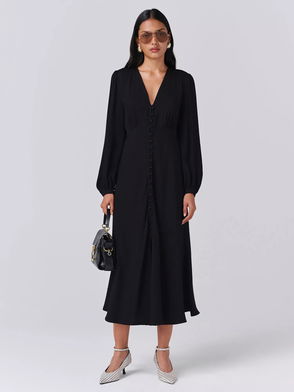 Anouk is a long midi dress in fluid viscose with a flattering deep waistband for definition, a round neck with shirring detail and short sleeves with a narrow cuff. Gentle gathering on the bodice and at the waist add soft texture to the style. Side zip fastening.