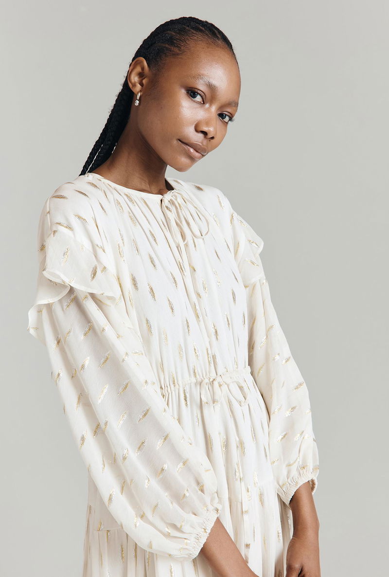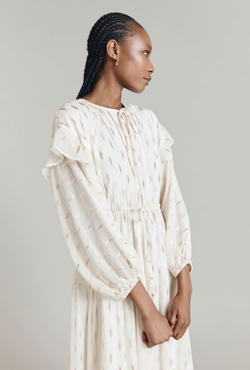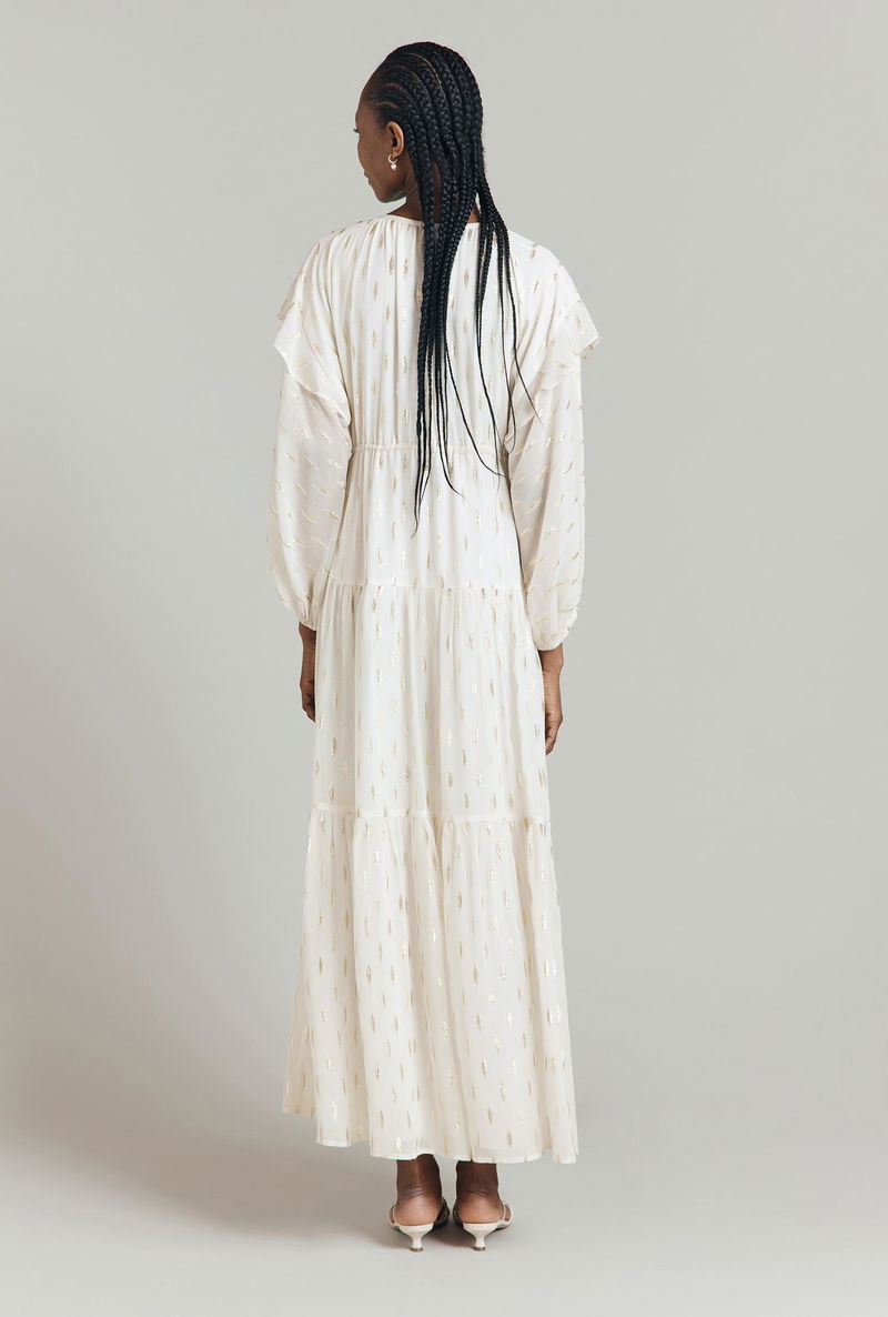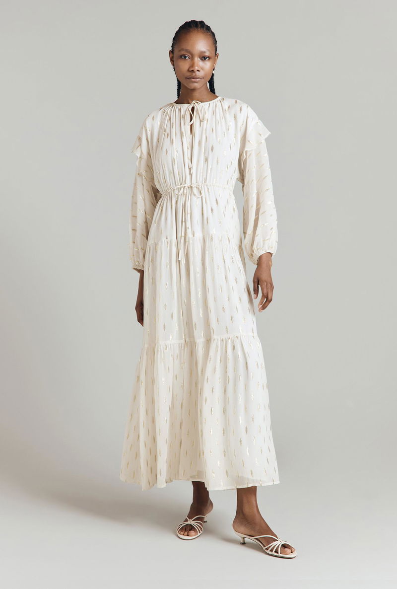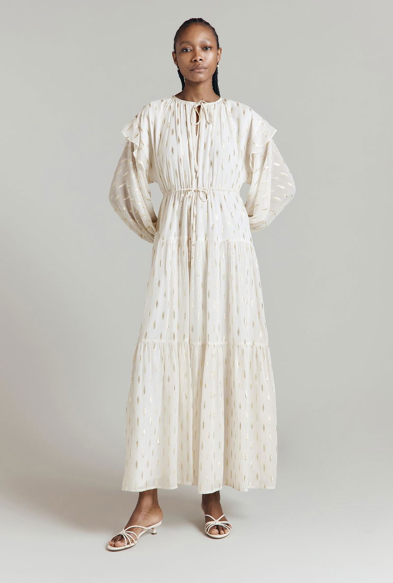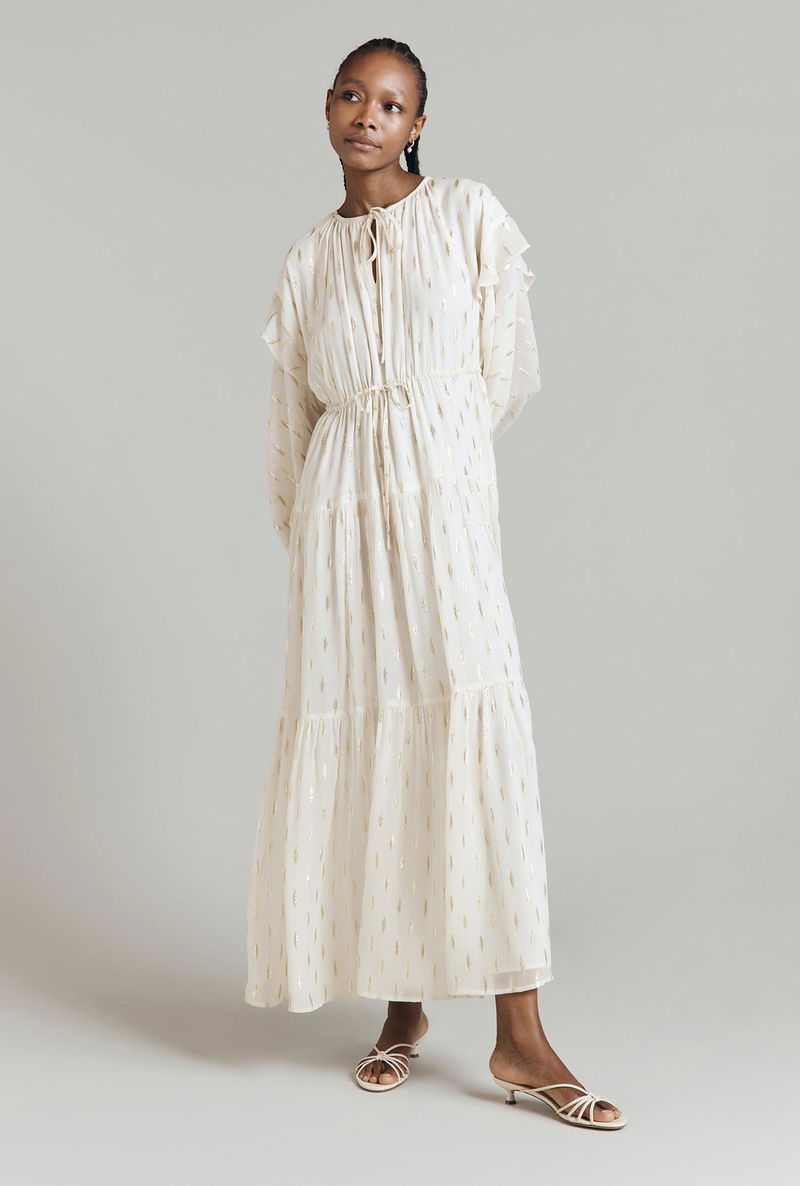 We’ve taken the style signatures of a kaftan and elevated them to create Camille, a viscose maxi dress with metallic jacquard embellishment. This tiered style has a bohemian feel with long blouson sleeves finished with a soft ruffle at the dropped shoulders, keyhole detail at the neck and a drawstring waist that can be adapted to fit. Fully-lined.