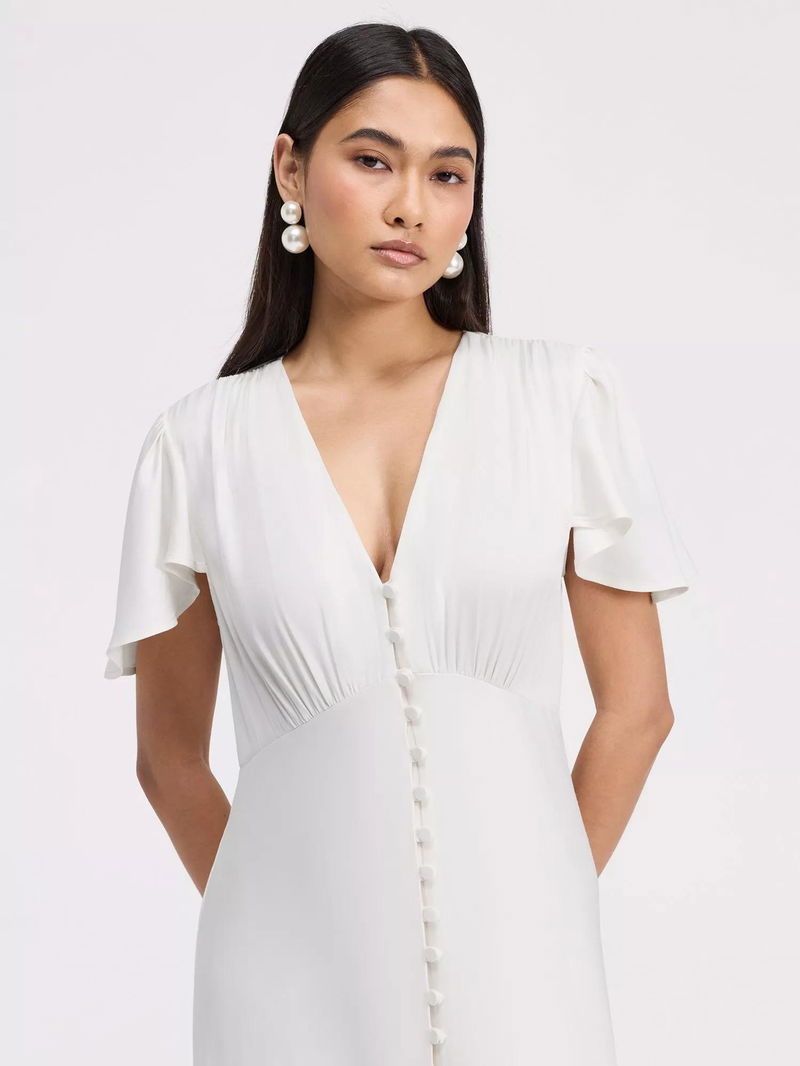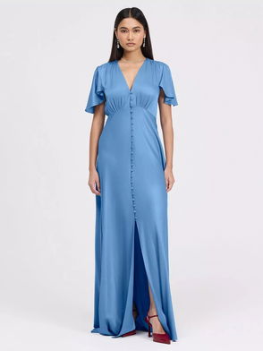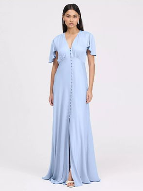 The Delphine button up dress is a satin maxi designed for bridesmaids and special occasions. Featuring a flattering v-neckline, soft angel sleeves, and a bias-cut silhouette. Skims the body elegantly while offering graceful coverage at the shoulders.