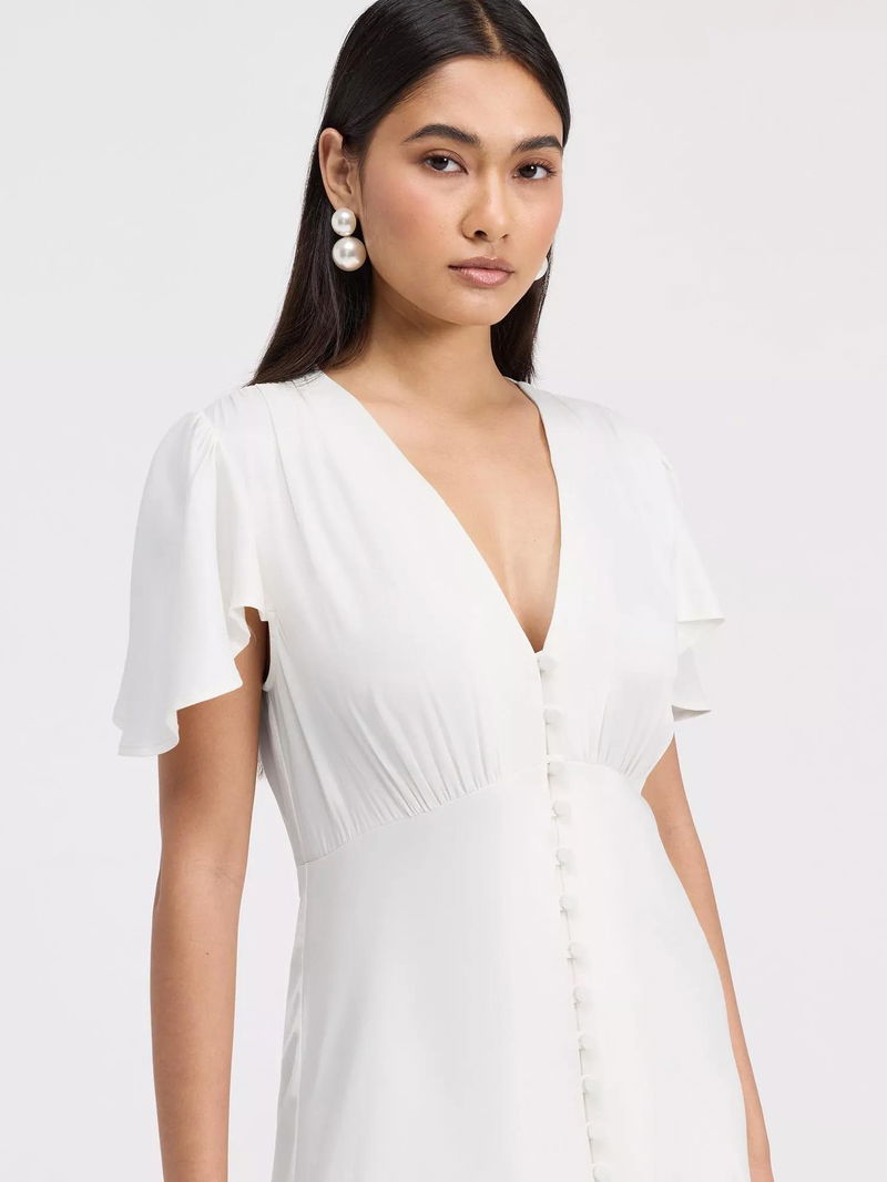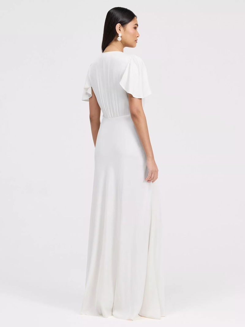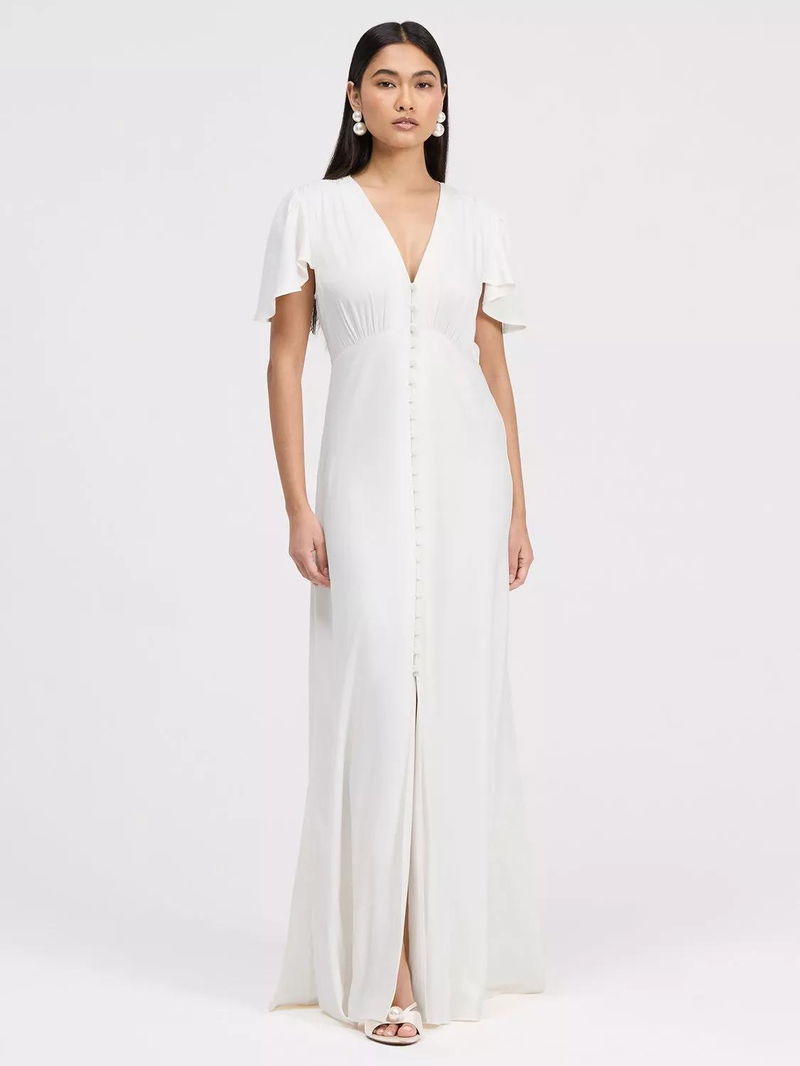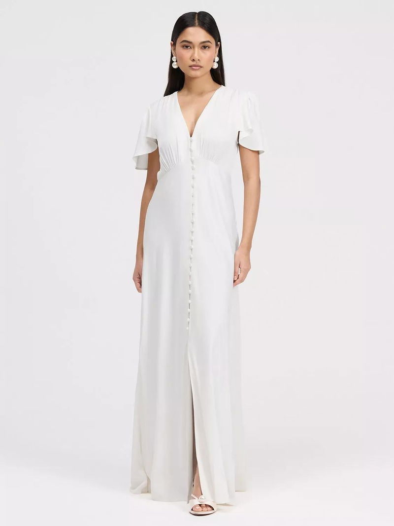 A button-through front adds subtle detail, and the maxi length ensures timeless sophistication, making Delphine a polished v-neck bridesmaid dress and versatile maxi bridesmaid dress option.