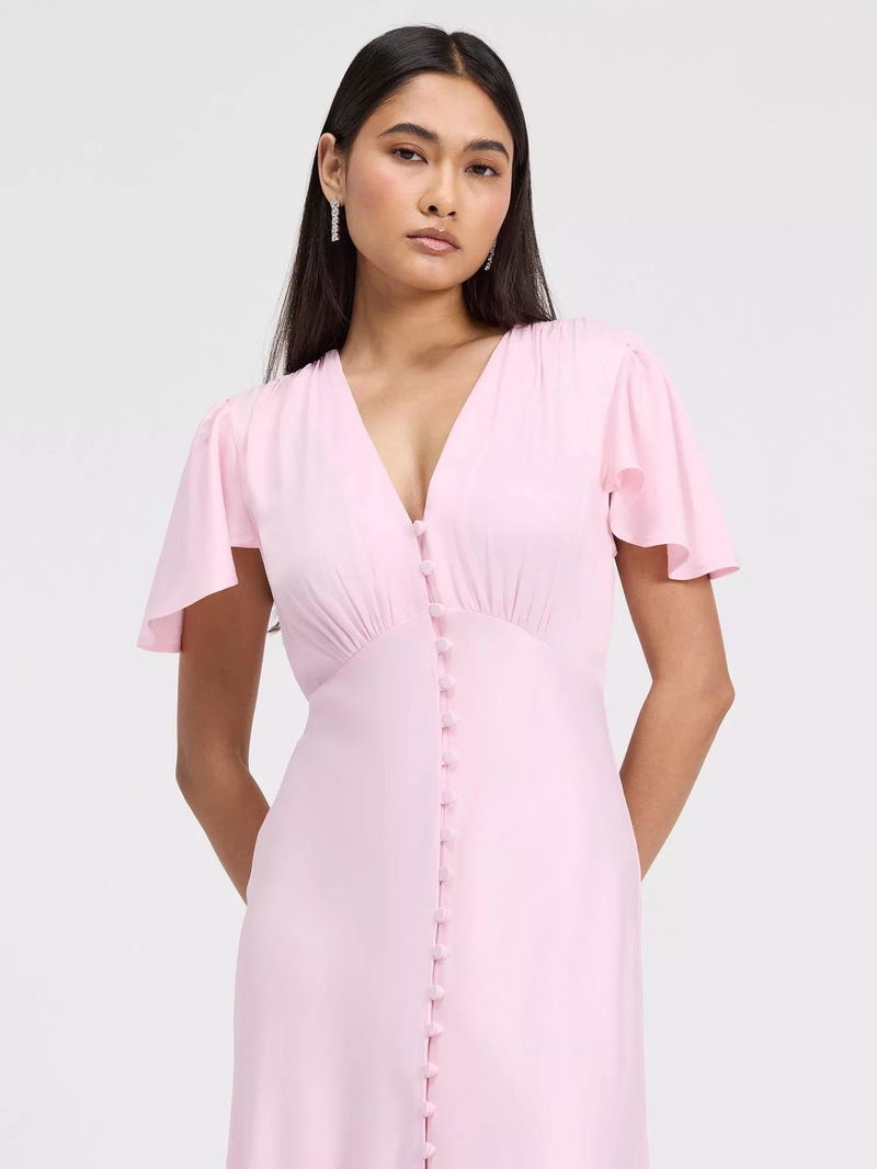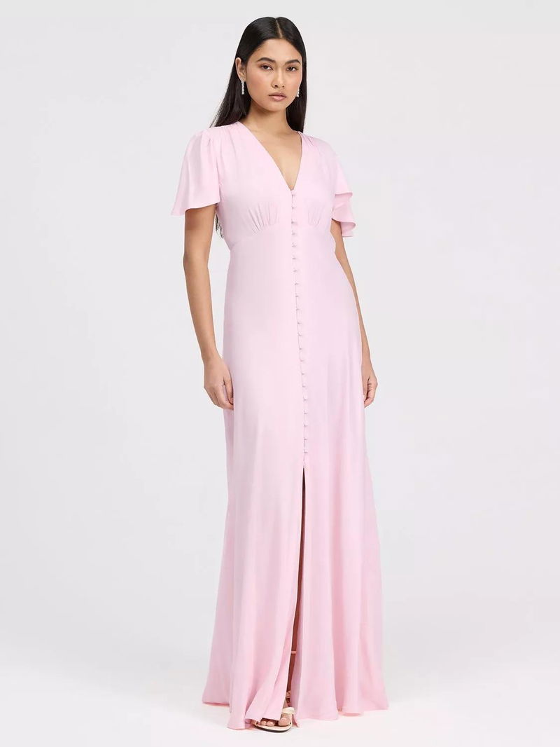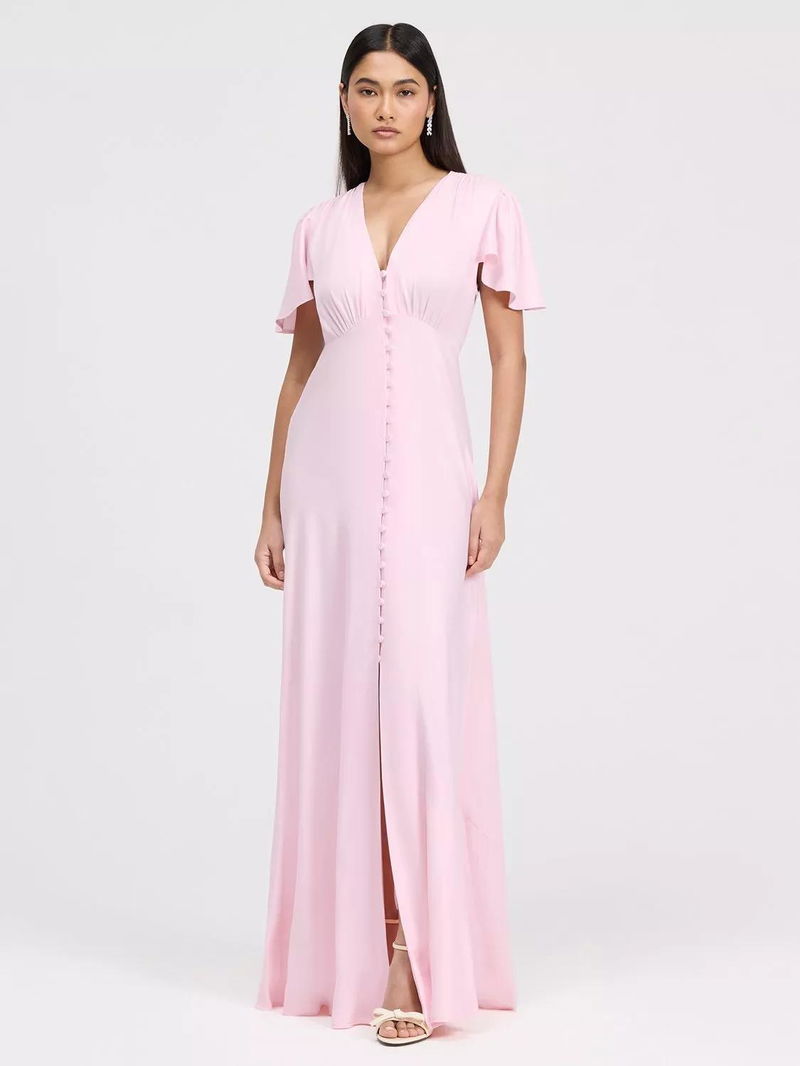 The Delphine button up dress is a satin maxi designed for bridesmaids and special occasions. Featuring a flattering v-neckline, soft angel sleeves, and a bias-cut silhouette. Skims the body elegantly while offering graceful coverage at the shoulders. A button-through front adds subtle detail, and the maxi length ensures timeless sophistication, making Delphine a polished v-neck bridesmaid dress and versatile maxi bridesmaid dress option.