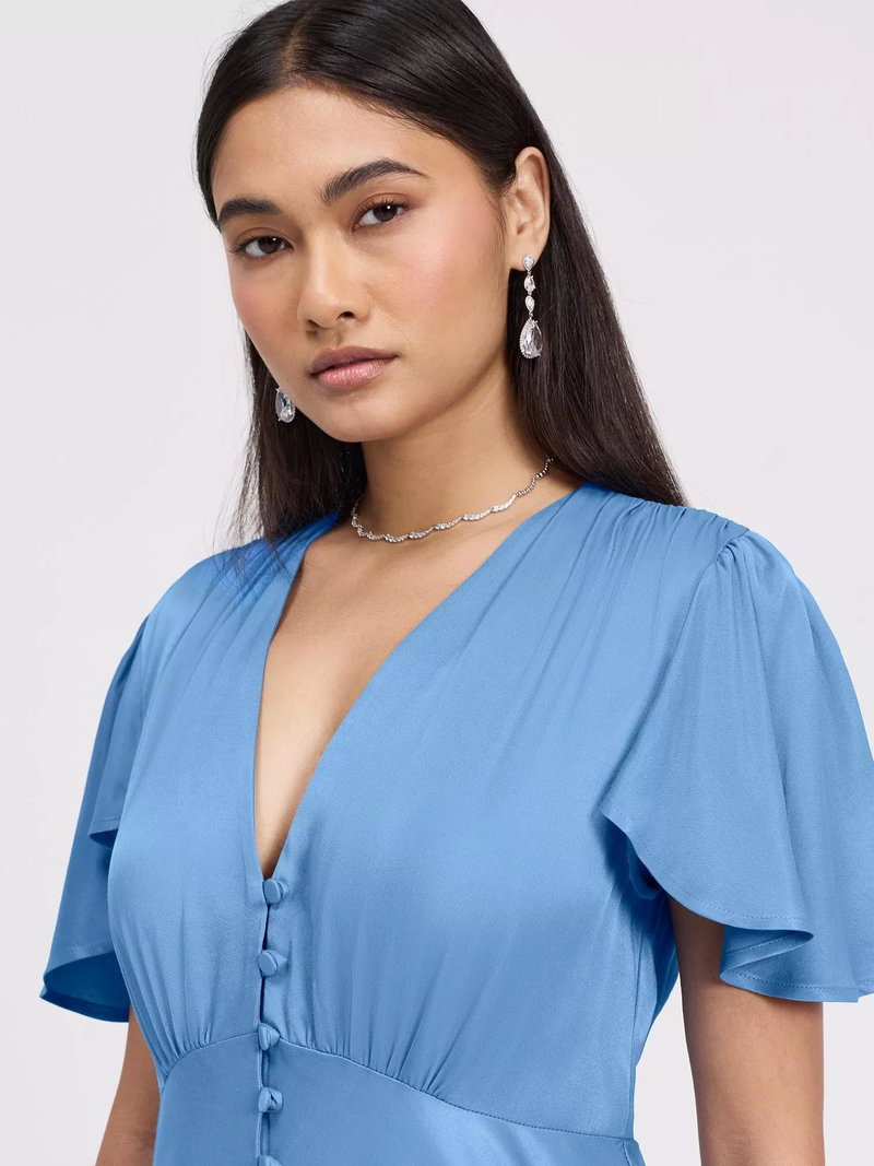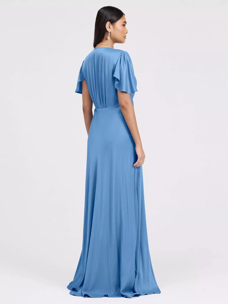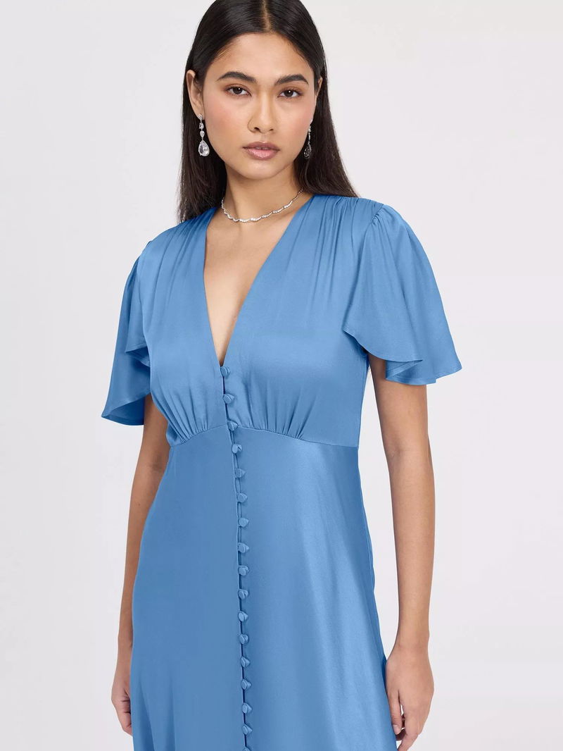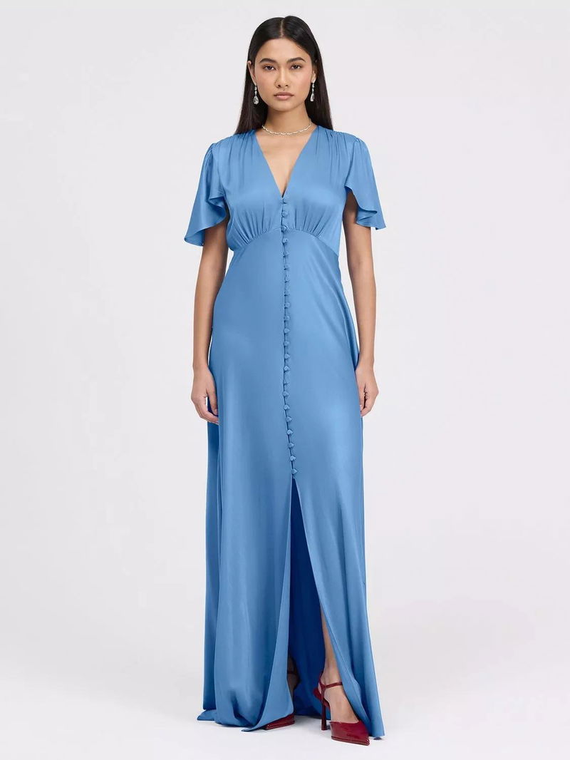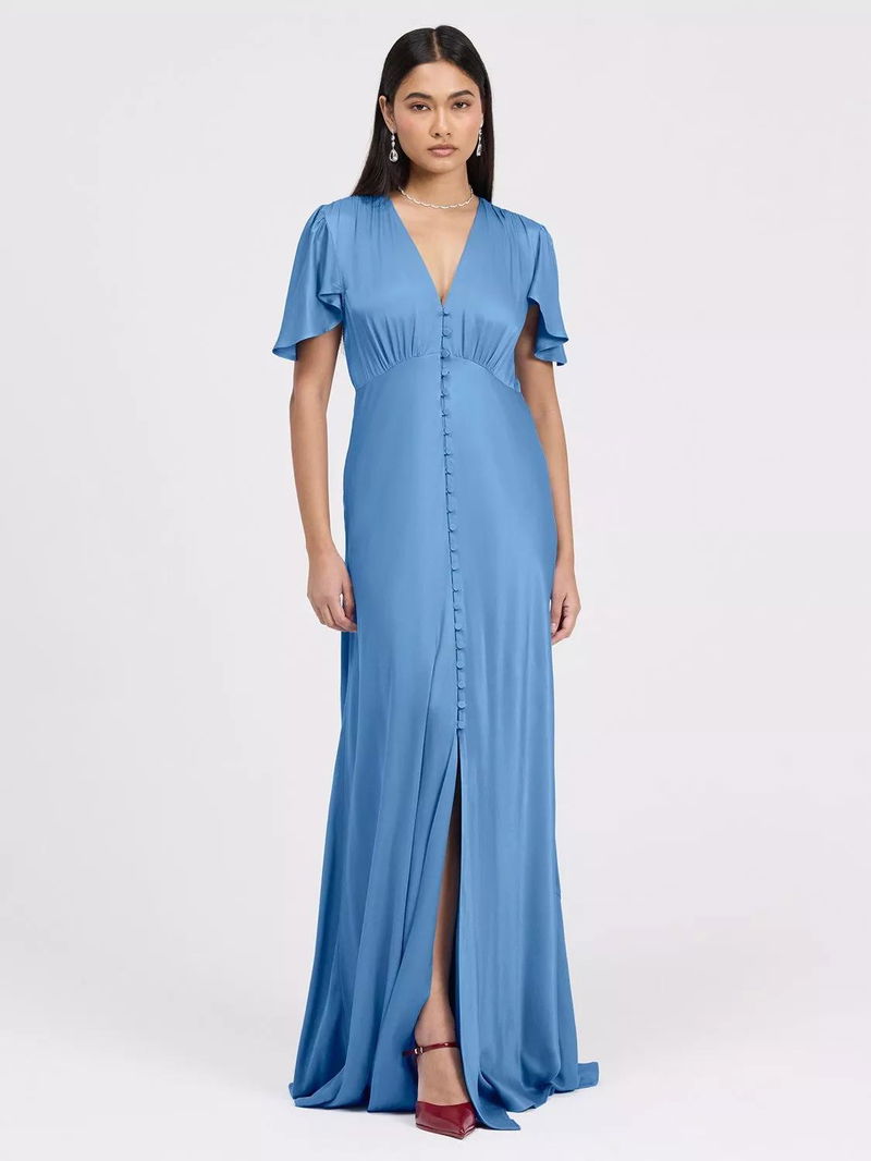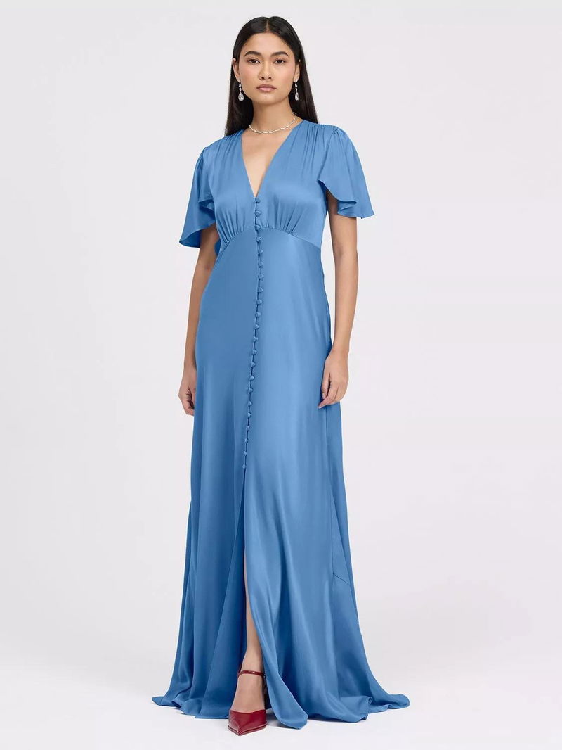 The Delphine button up dress is a satin maxi designed for bridesmaids and special occasions. Featuring a flattering v-neckline, soft angel sleeves, and a bias-cut silhouette. Skims the body elegantly while offering graceful coverage at the shoulders. A button-through front adds subtle detail, and the maxi length ensures timeless sophistication, making Delphine a polished v-neck bridesmaid dress and versatile maxi bridesmaid dress option.
