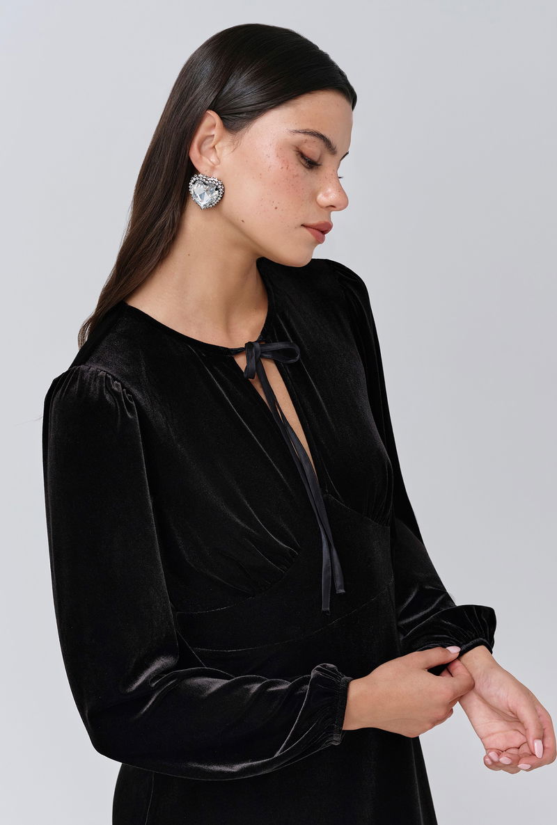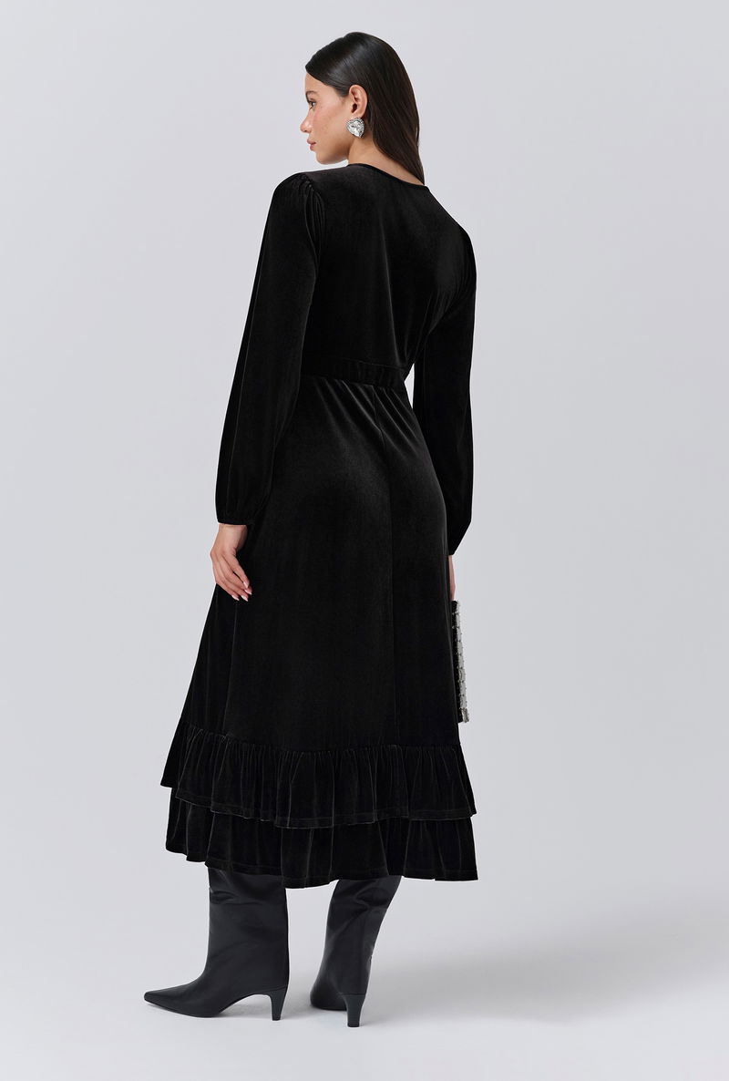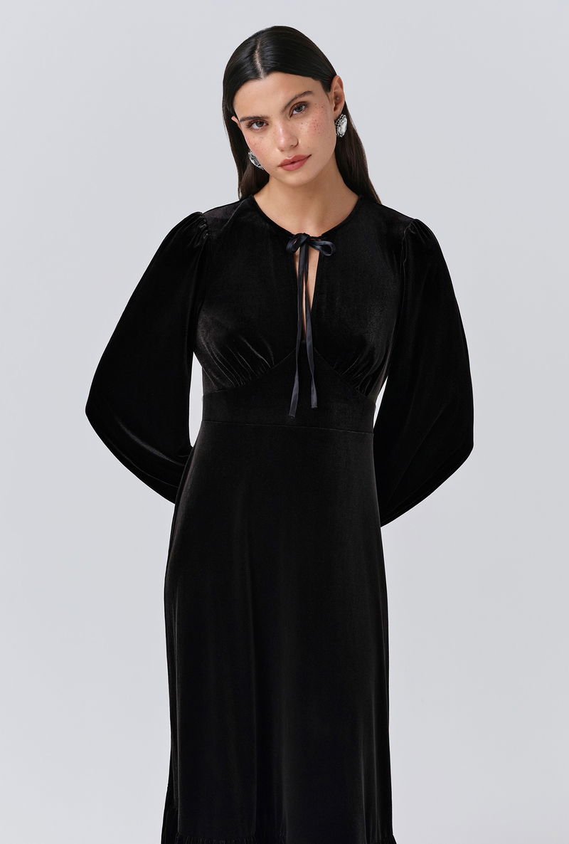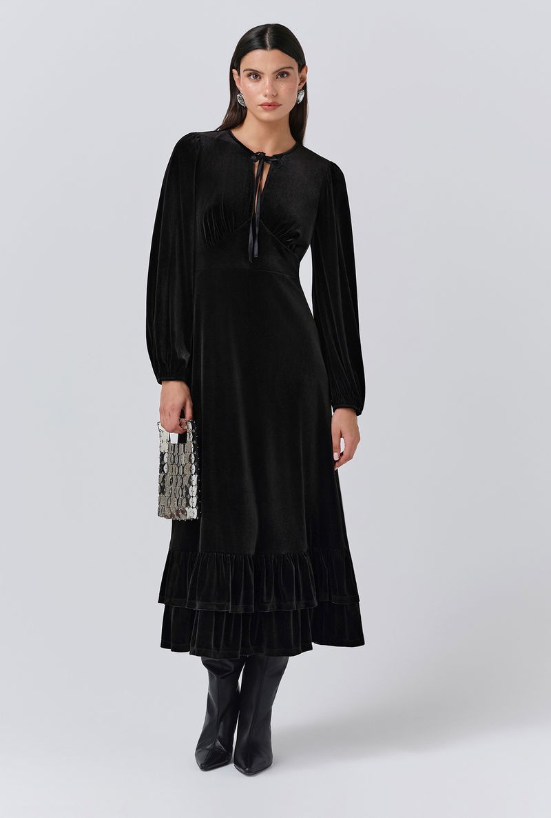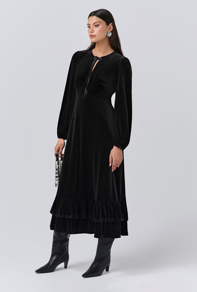 Quietly dramatic is how we would describe Elenanor, a midi dress that’s rich in vintage-inspired details but feels completely contemporary. Featuring a keyhole front opening, voluminous 3 1/4 length sleeves and a frill-tiered skirt, it’s crafted from soft velvet jersey fabric. Style it with heeled boots for a high-impact look.