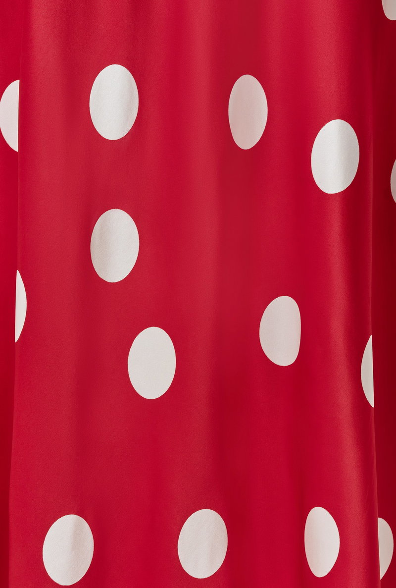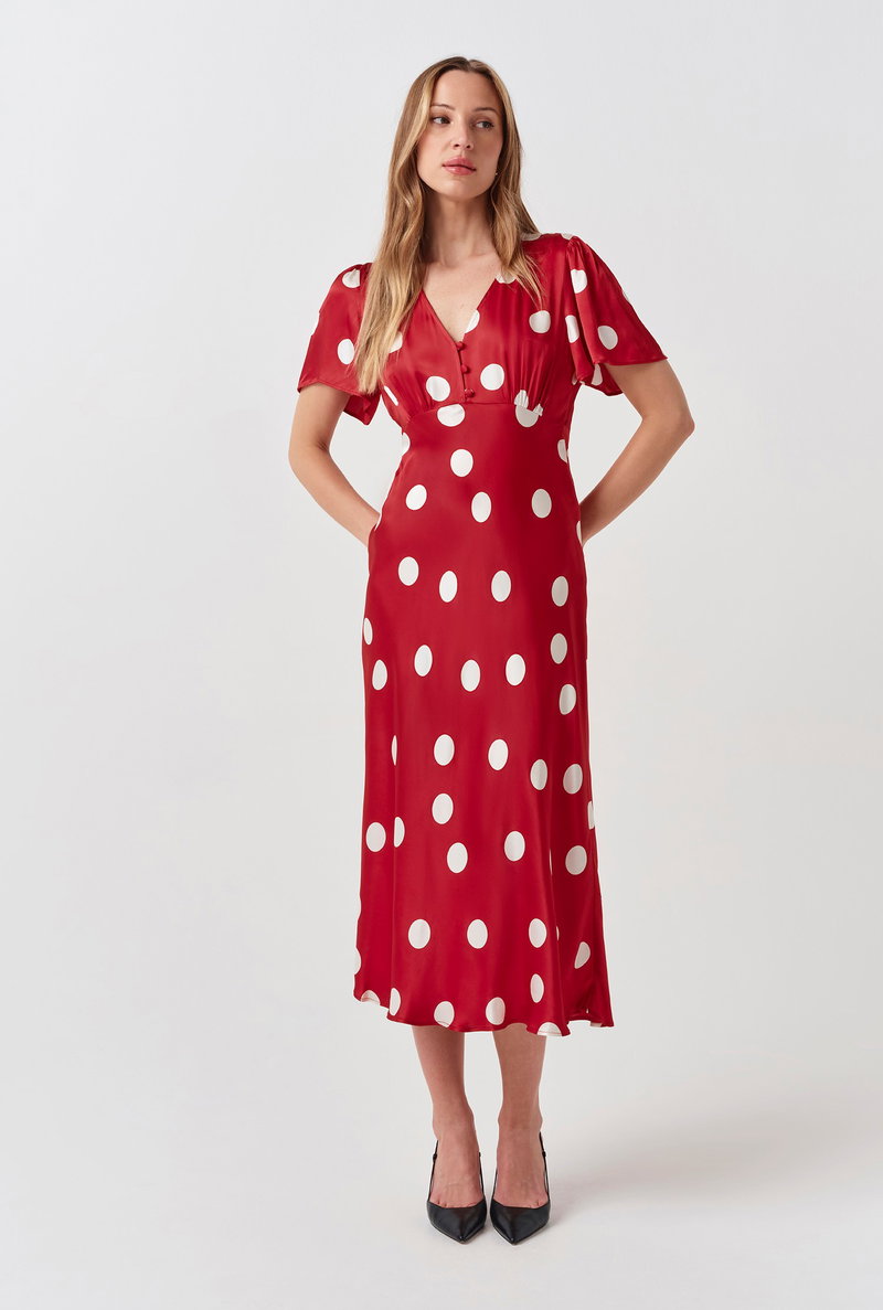 We’ll never grow tired of polka dots, and neither will your wardrobe. With a classic bias cut skirt, angel sleeves and front button detailing, Elizabeth is an easy-to-wear midi masterpiece that perfectly marries a timeless silhouette with a contemporary twist on an enduring print. Crafted from the brand’s signature satin fabric with a concealed side zip fastening.