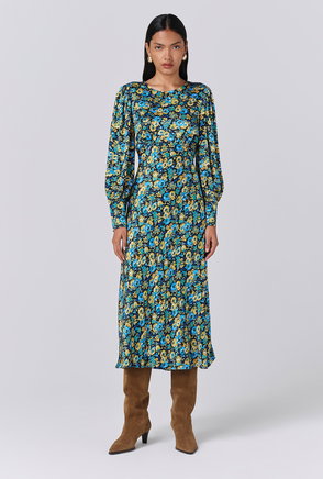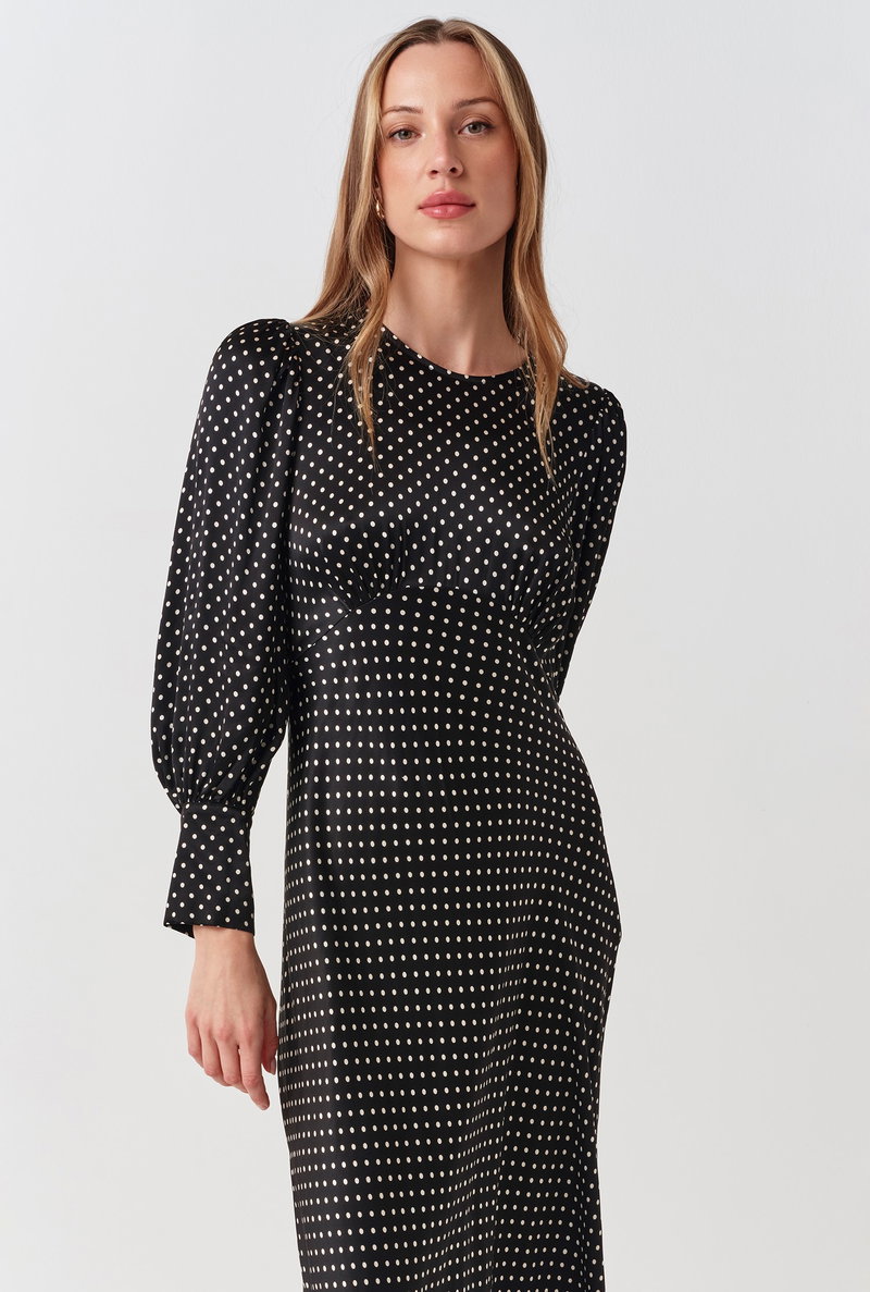 Refined style at its very best, Fiona is an elegant bias cut midi dress that will work for a variety of occasions for years to come. Featuring a simple round neckline, long sleeves with extended cuffs and button detailing, a flattering under bust seam and crafted from a timeless polka dot print satin for maximum comfort and wearability.