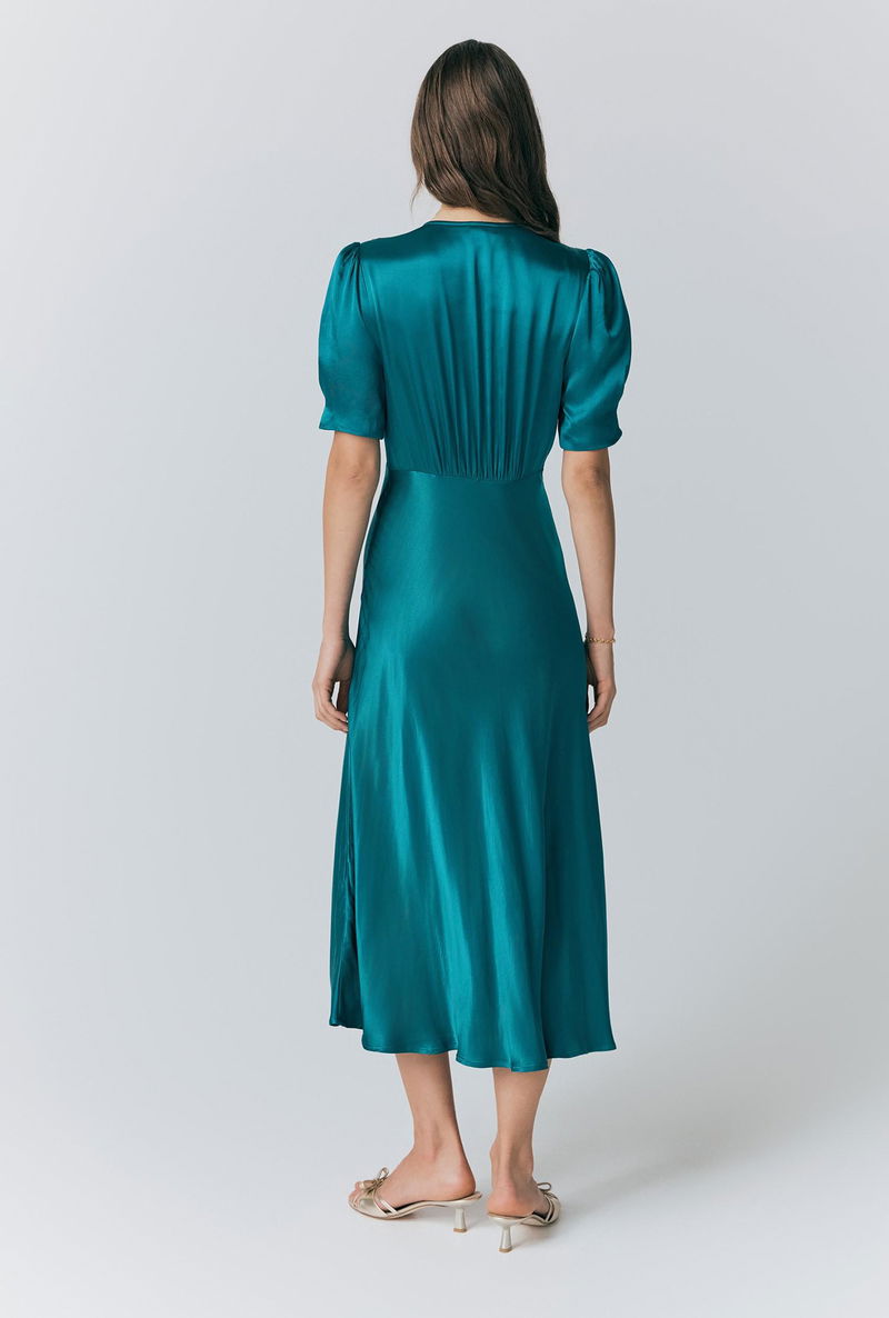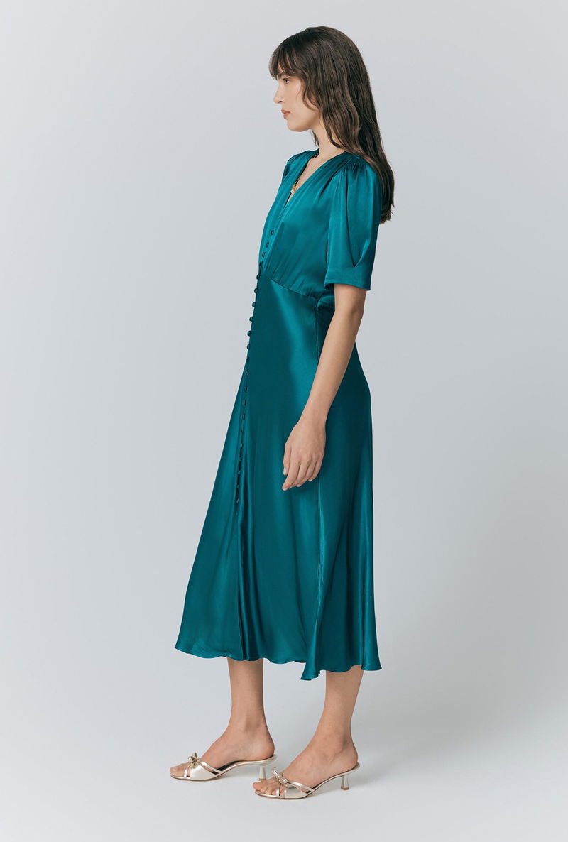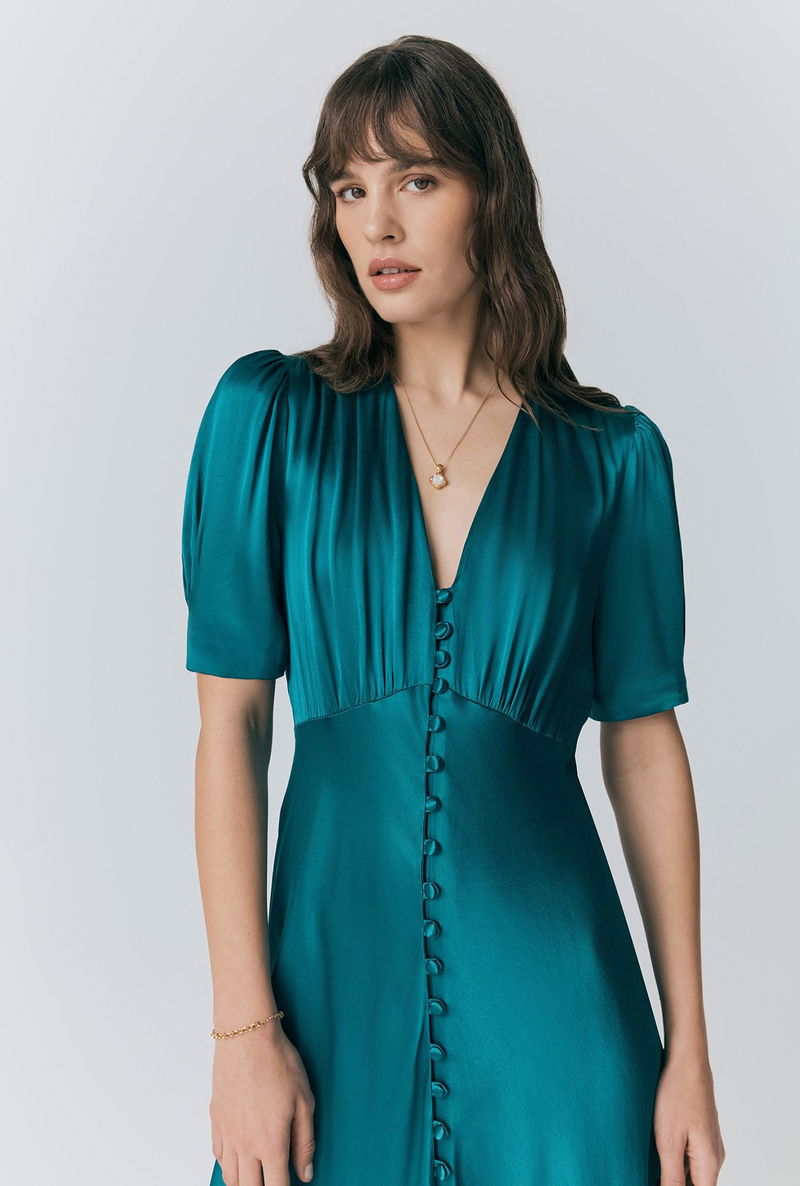 If you need a simple yet striking outfit, look no further than our Madison dress. Cut from sustainable EcoVero satin, this vintage-inspired emerald green satin v-neck midi dress features puff shoulders, a button-down front and three-quarter length sleeves. With a classic silhouette and front split detail, this ultra-feminine dress will endure season after season – plus it would also make the perfect bridesmaid dress.