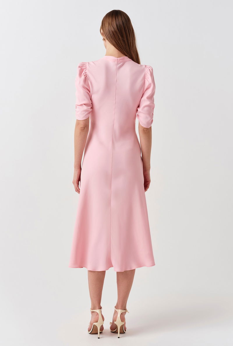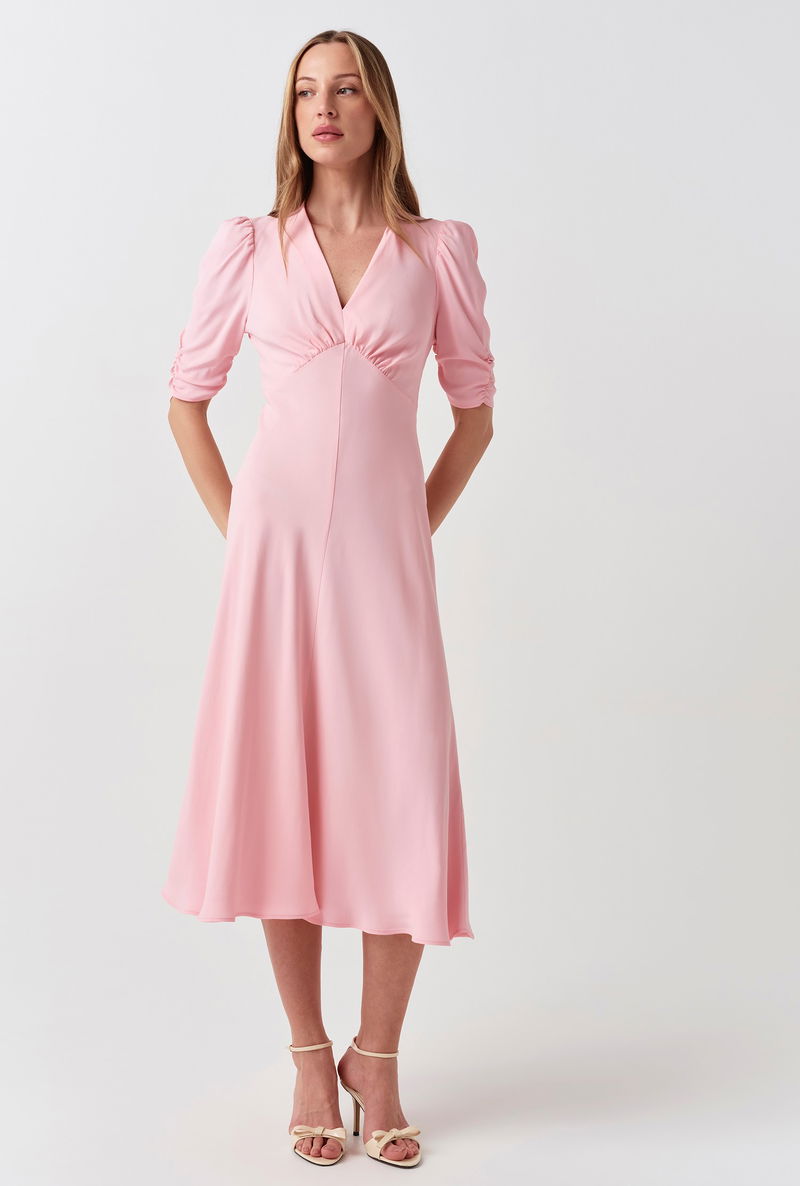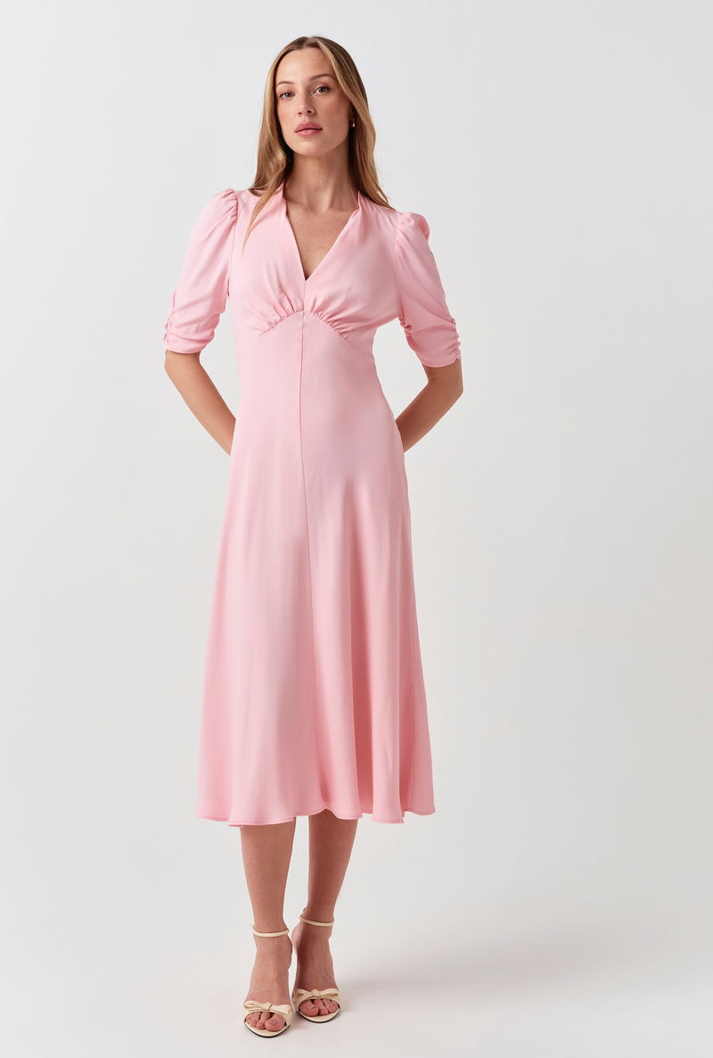 Effortlessly feminine, the Mia Dress is a quintessential tea dress for any occasion. Crafted with our signature bias cut for a fluid, flattering silhouette, this midi dress features a graceful V-neckline and elegant gathered shoulder detailing. The elbow-length sleeves provide a refined touch to this classic short-sleeve dress, making it a versatile choice for weddings or weekend lunches. A sophisticated V-neck dress designed to be cherished for seasons to come.