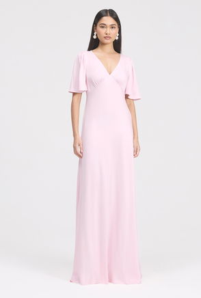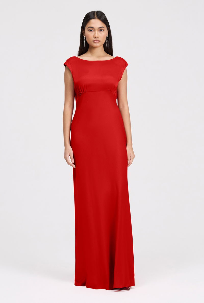 The Octavia boat neck dress is a graceful, satin maxi designed for elegant bridesmaids. Featuring a classic boat neckline, soft cap sleeves, and a flowing bias-cut silhouette with an empire seam.