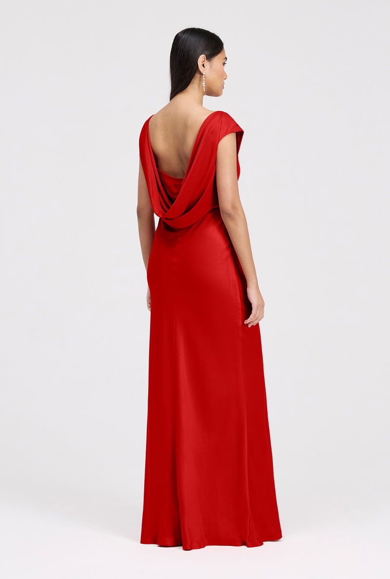 A draped cowl back adds subtle drama, while the maxi length ensures polished sophistication, making Octavia a refined choice for a boat neck, stylish, long bridesmaid dress.