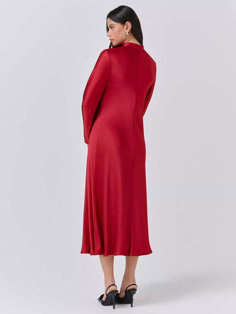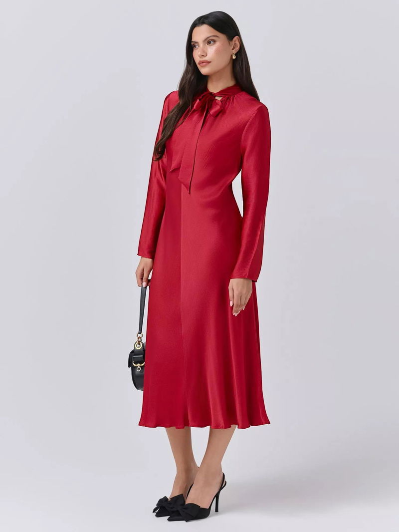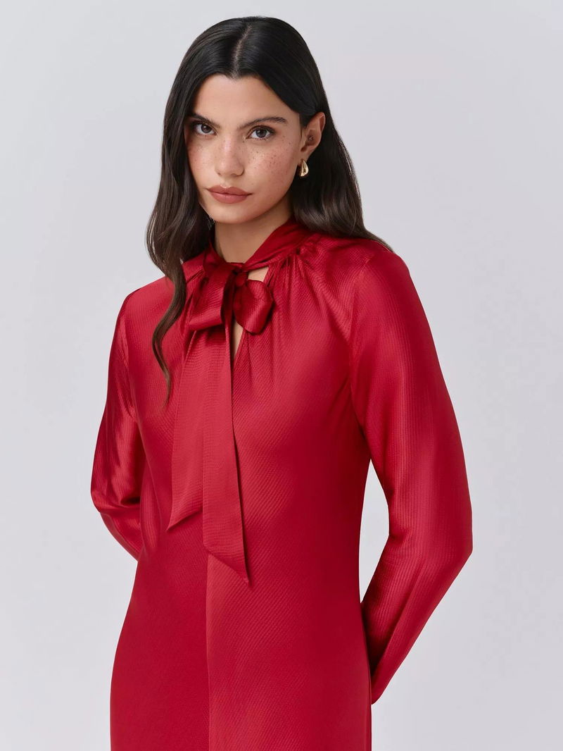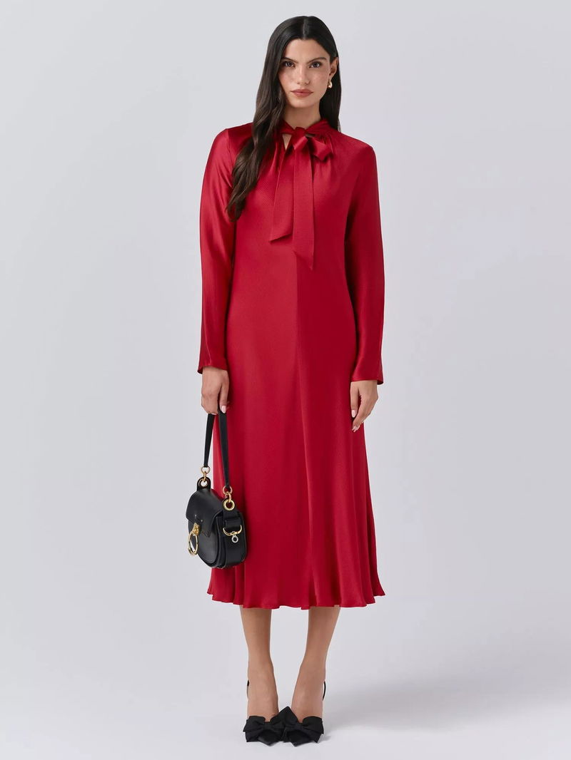 This midi dress from Ghost brings fresh perspective in soft satin. The tie neck and A-line shape create a smart yet relaxed silhouette, while soft viscose drapes smoothly to keep you at ease through busy days.