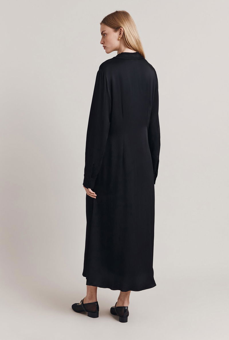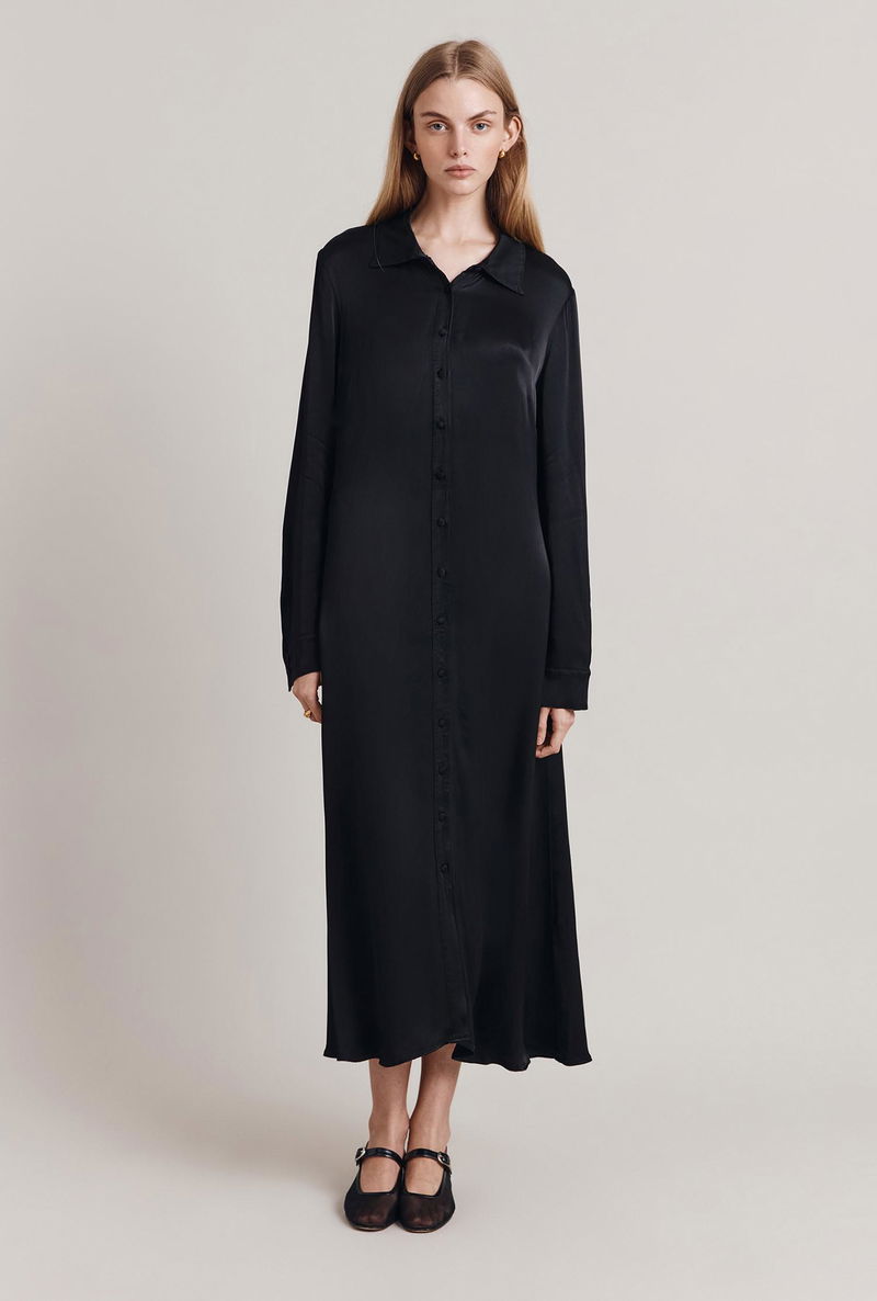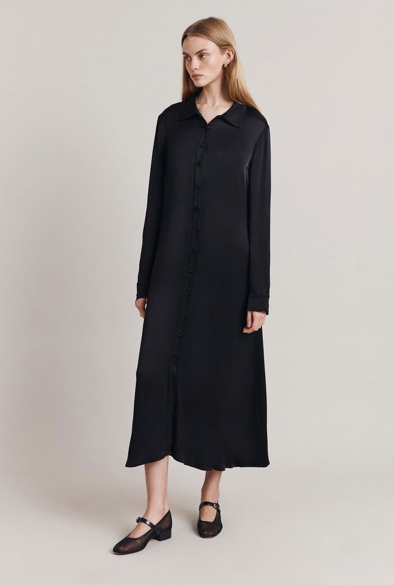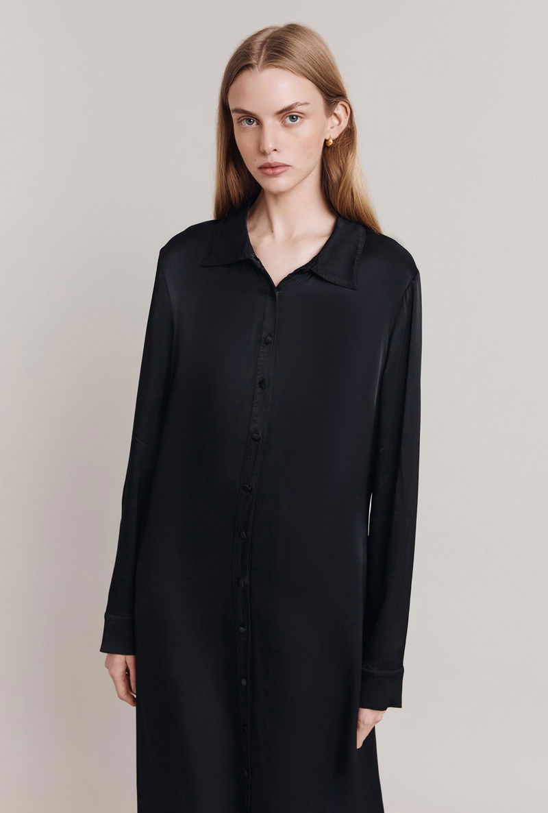 Minimal and chic, Thea is a maxi shirt dress that will become a staple in your wardrobe thanks to its simplicity. Cut with a relaxed, oversized fit, this sleek dress features a run of delicate covered buttons down the front and on the cuffs as well as a subtle spread collar. Cut in our signature satin, it falls beautifully to the ankles and boasts graceful movement that works with the body.