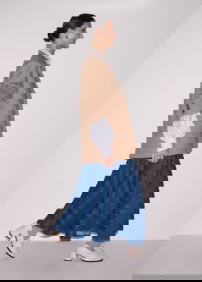 You can choose to wear it buttoned to the top or positioned off one shoulder.
