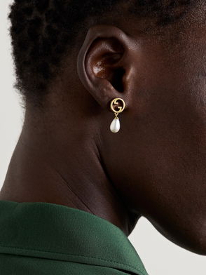 Gucci's earrings feature its iconic 'GG' motif nestled inside a halo of rich agate. They've been made in Italy from 18-karat rose gold and look especially chic with the coordinating ring.