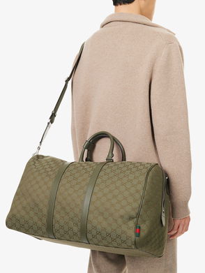 The Gucci Edge Medium duffel bag from Gucci is crafted from GG-debossed matte fabric, a historic interpretation of founder Guccio Gucci's initials. The design features a luggage tag, structured top handles, and a detachable strap.