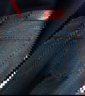 Offering casual sophistication, these Gucci jeans are destined to become a wardrobe staple. They're made from cotton denim with flared legs, soft fading, and a 5-pocket construction.