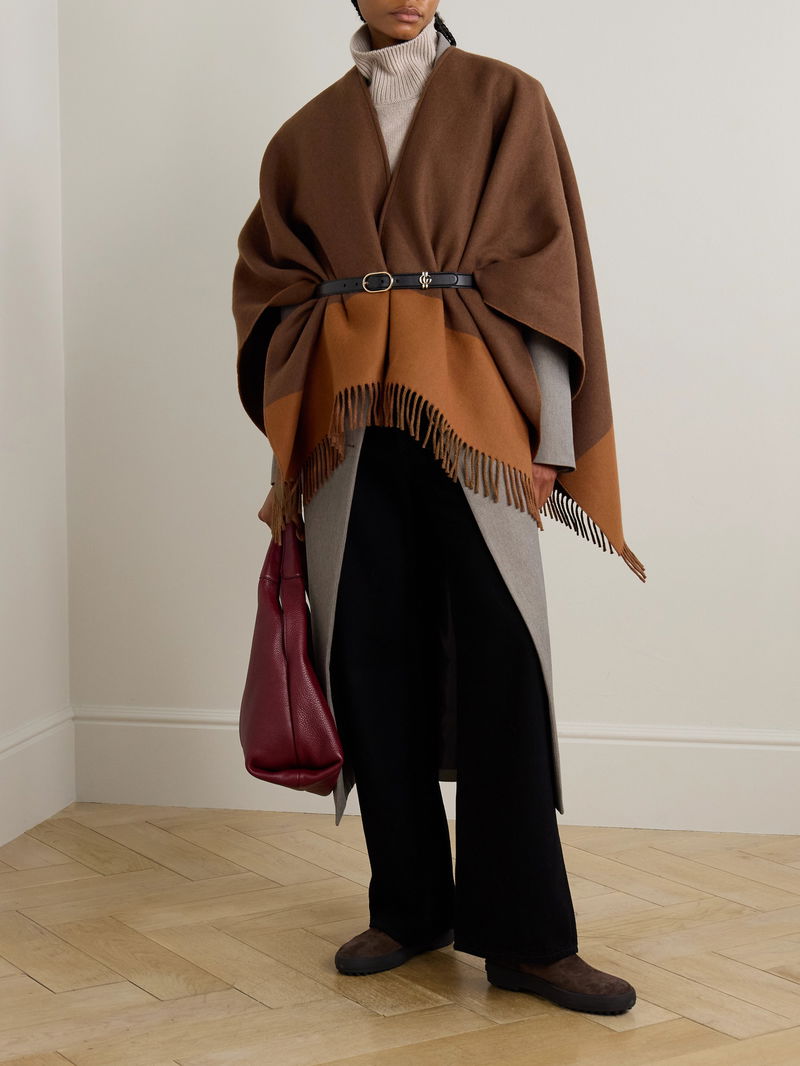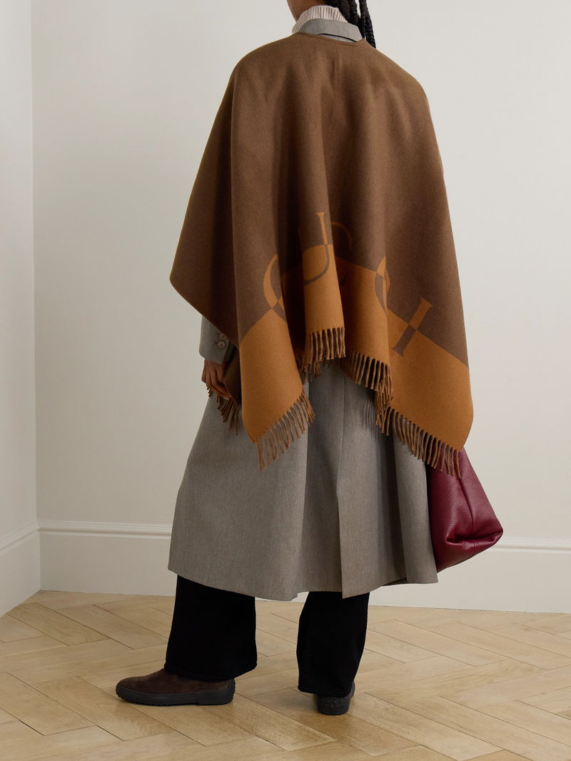 Gucci's wrap will bring quiet elegance to your evening ensemble. It's made from warming wool and cashmere blend with a color-blocked hem and fringing along the edges.
