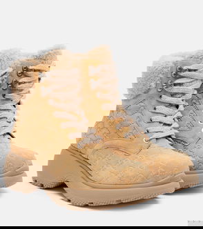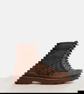 Inspired by military styles, Gucci's ankle boots are made from leather and debossed with the label's signature 'GG' motif all-over. They're set on chunky rubber soles and have pull tab and gold-tone hook eyelets for the laces. Wear them with everything from jeans to dresses.