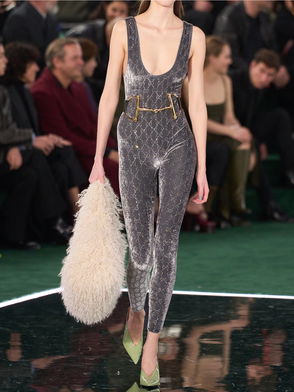 The iconic GG pattern has been part of Gucci's codes since the early '70s. The Hammered GG satin jumpsuit features a classic collar, a detachable belt, and is finished with partially buttoned closure.