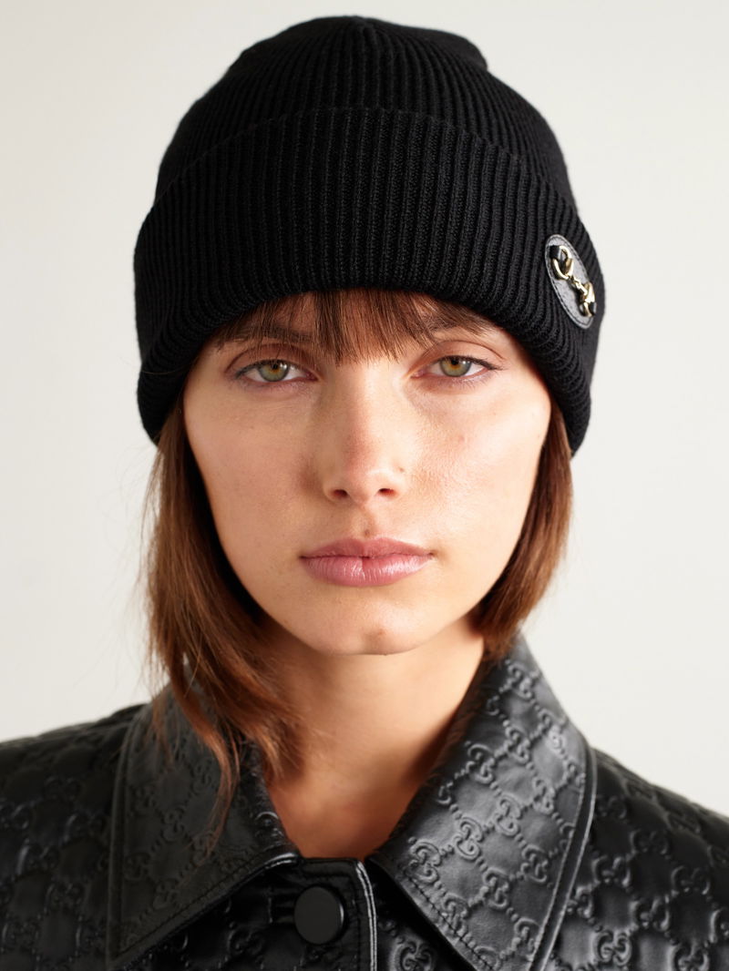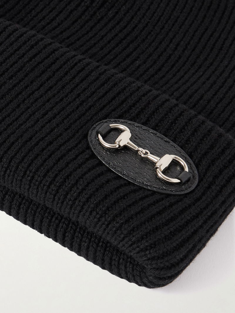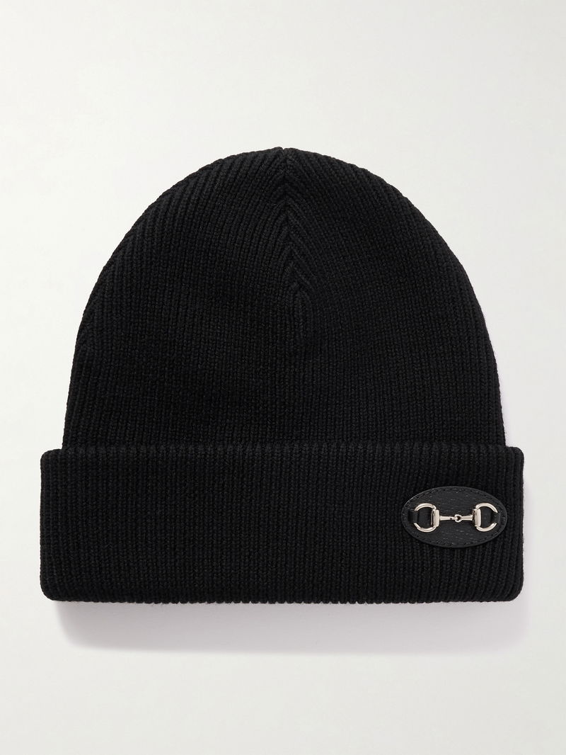 Horsebit-detailed Appliquéd Ribbed Wool Beanie