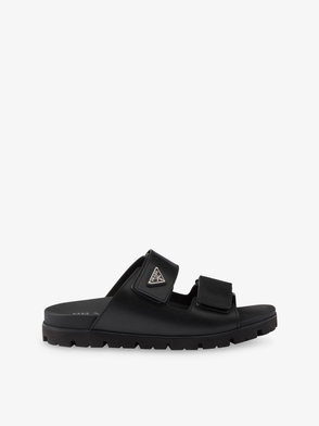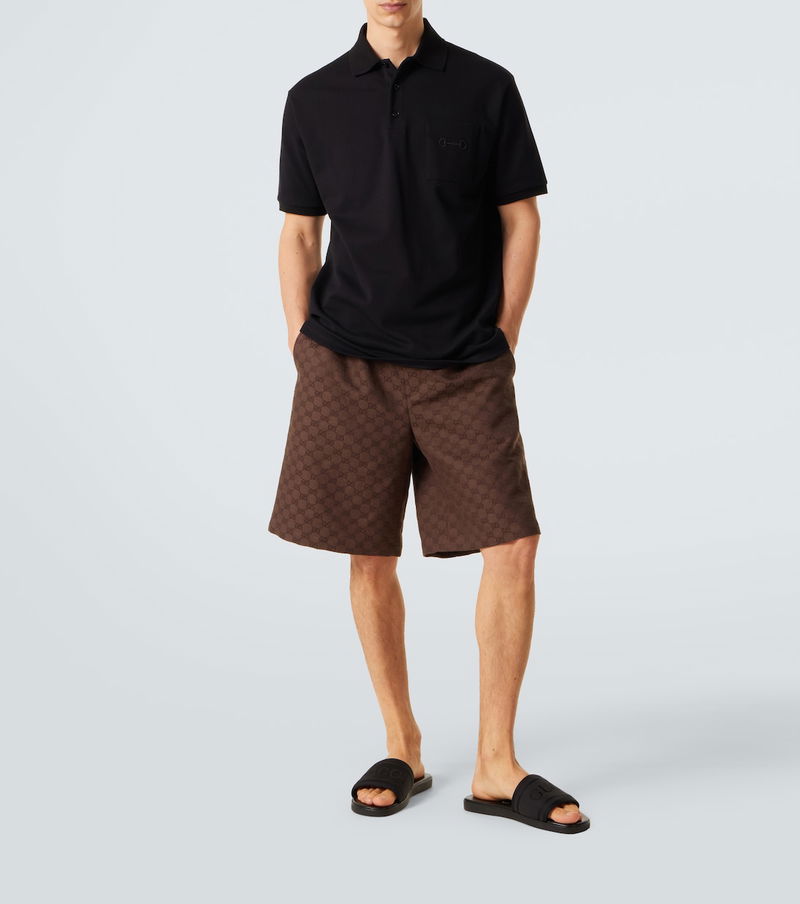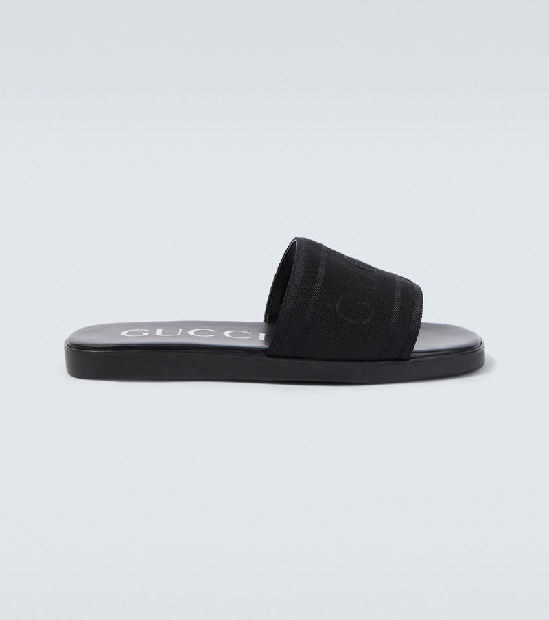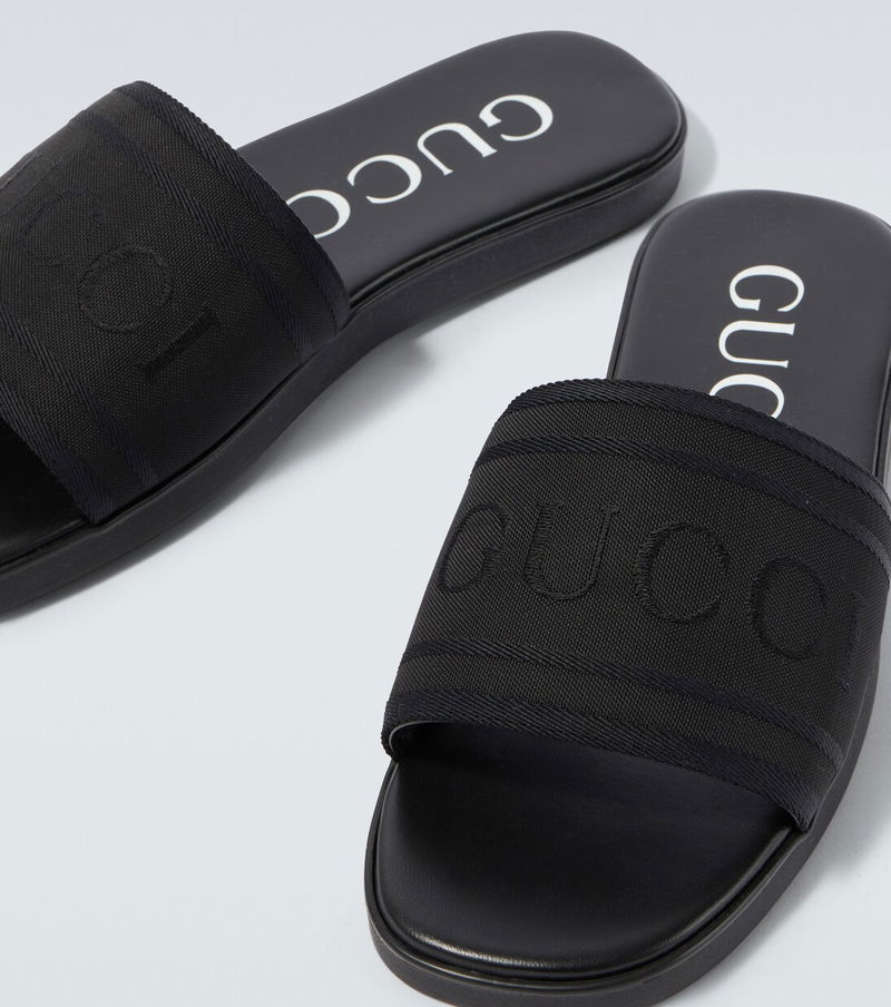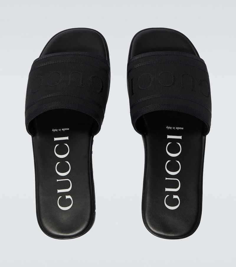 These Gucci slides blend optimal comfort with distinctive style. Made from leather with canvas upper straps, the pair boasts jacquard logos and contrasting lettering on the insoles.
