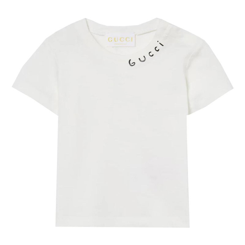 Gucci Printed Cotton T-Shirt pairs the House’s signature graphics with playful artwork by Euan Roberts. The piece stands out for its printed motif and practical shoulder snap closure for easy dressing.
