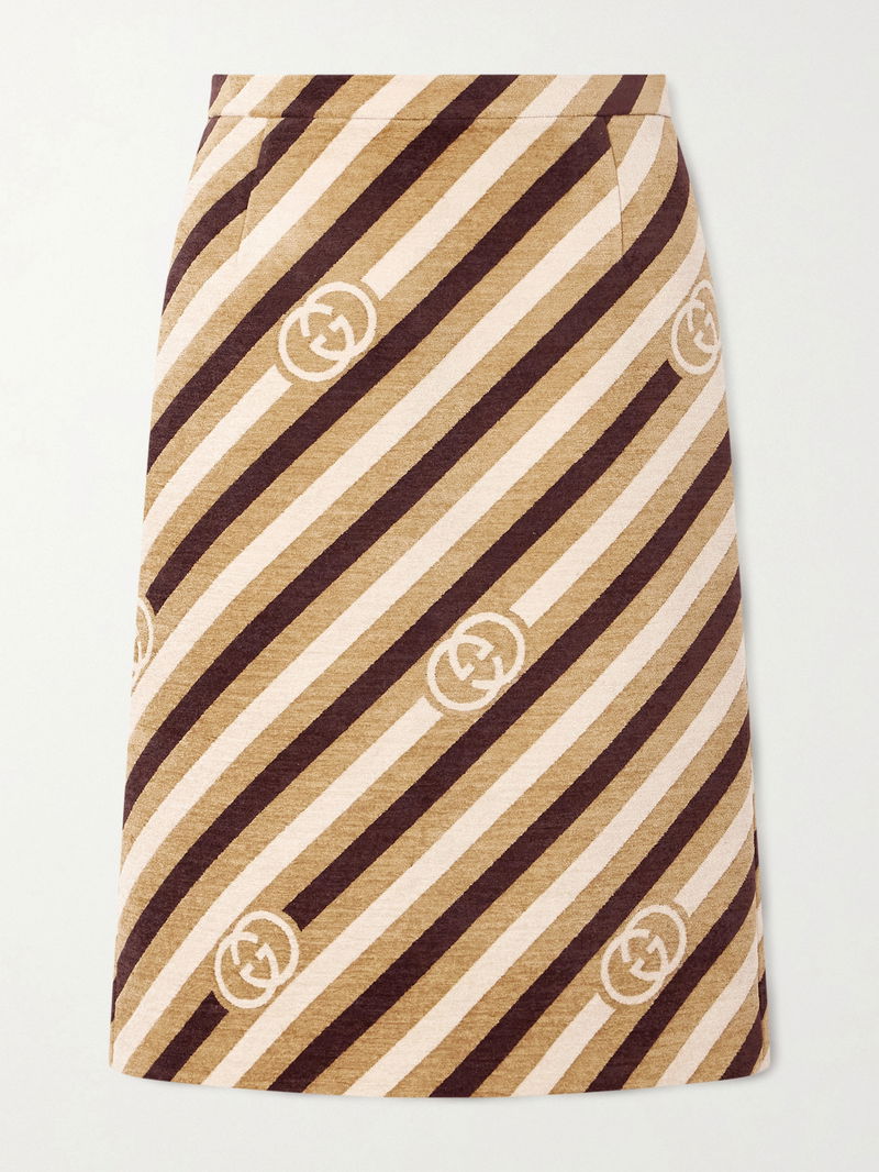 Gucci's skirt is the perfect tribute to the iconic emblem - it's jacquard-knitted with the interlocking G alongside striking diagonal stripes. It's been made in Italy from tactile chenille in a retro, neutral palette.