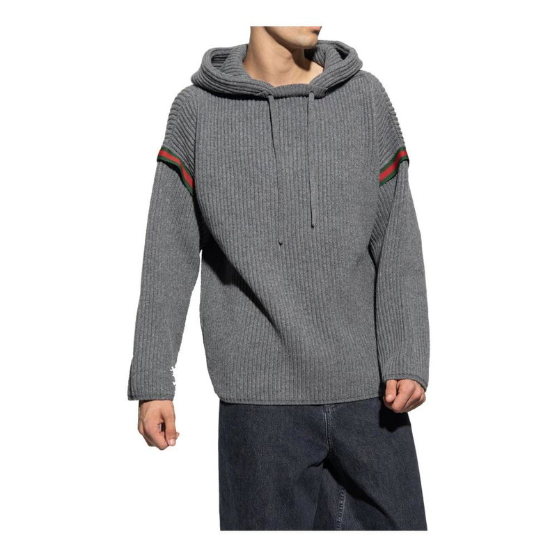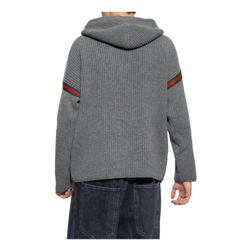 Gucci Tape Logo Knit Hoodie is a mid-weight wool-cashmere zip-up hoodie that features the brand's signature green and red Web stripe for a refined casual look.