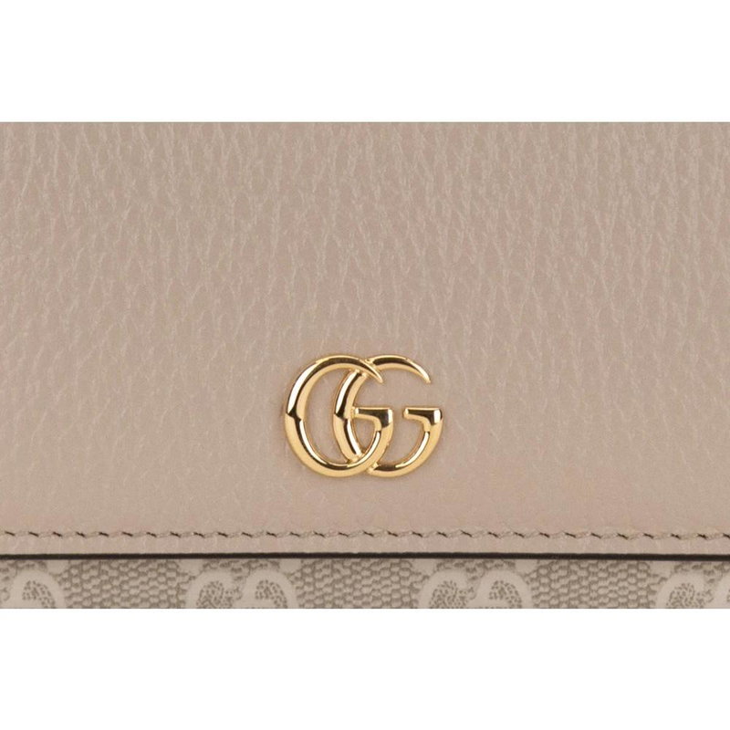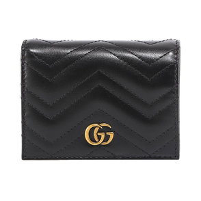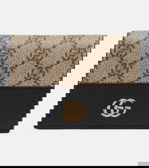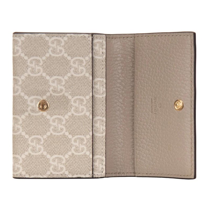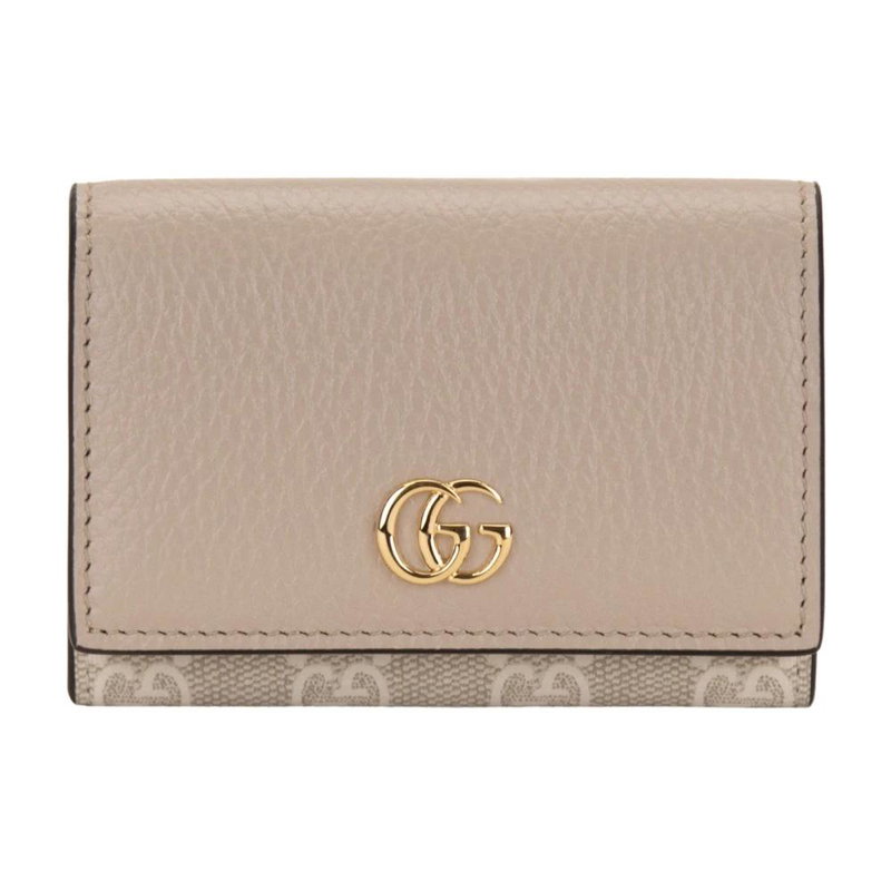 Gucci Wallet: a compact leather Wallet with a contrasting 'Gg' motif and gold-tone metal 'Gg' logo. Designed for organised everyday use, it features an external pocket and a fabric-lined double card/document slot with a snap closure. Key attributes.