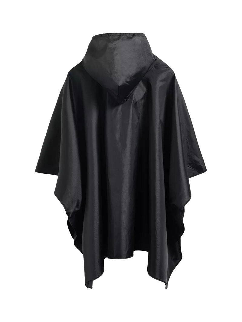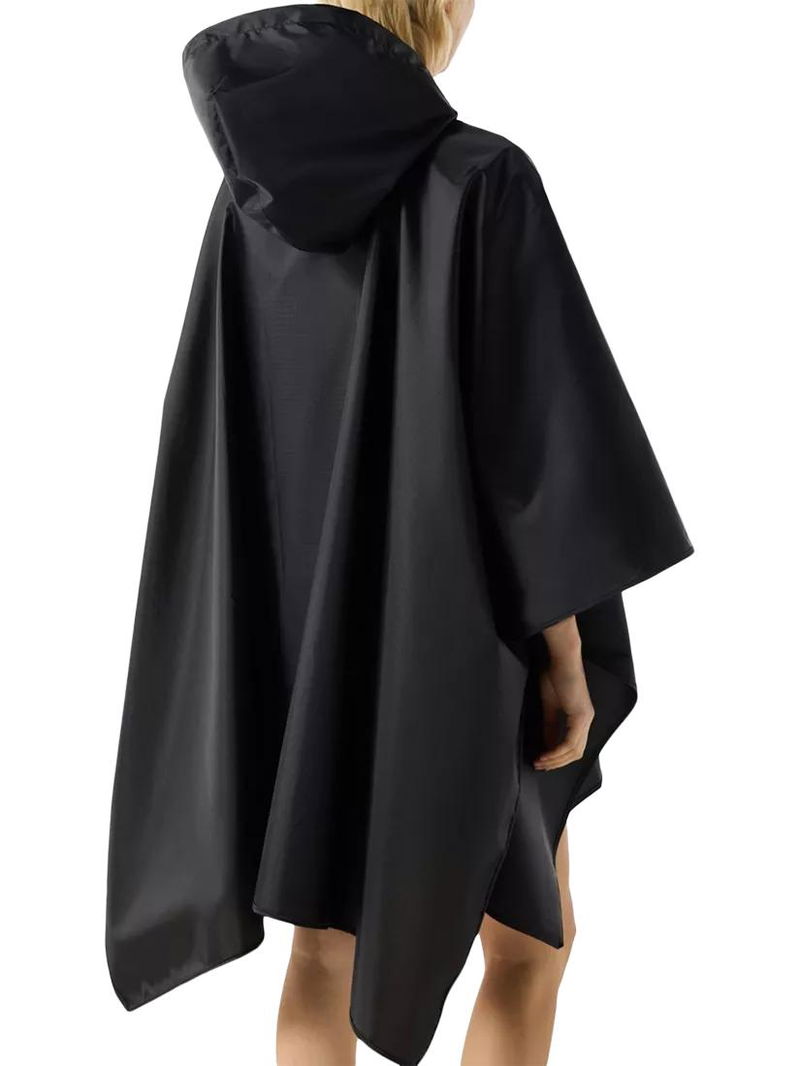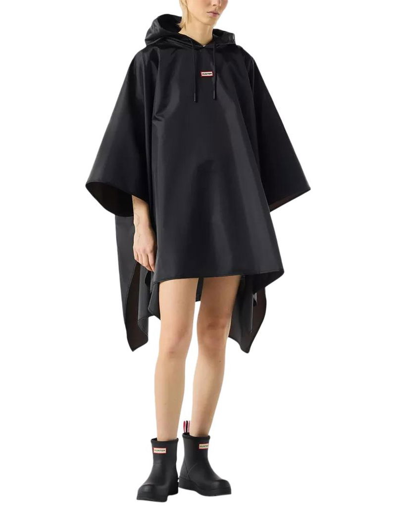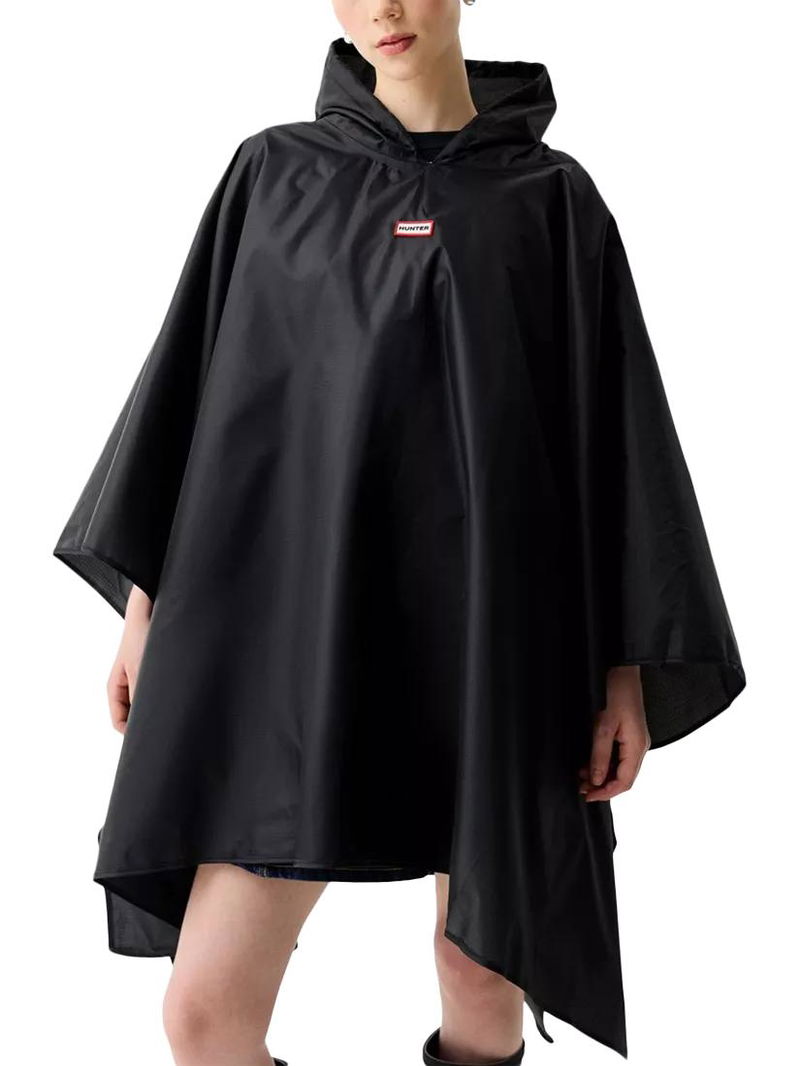 The ultimate rainy-day accessory, this lightweight unisex black poncho is water-resistant.. True to size, Unisex fit. Side snap closures and a hood with an adjustable drawstring offer extra protection, whilst being able to be packed into an attached bag.. Fashioned with our Hunter silicon badge, this poncho is easy to wear and perfect for festival fields or everyday city adventures.