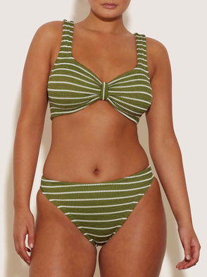 There's vintage feels all round with Ruby - embrace full-on retro with Ruby's bow shaped bandeau top and high-waisted bikini bottoms. Newly reimagined with lurex fabric for a glittery update.