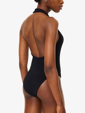 Hunza G's 'Tyra' swimsuit has an athletic spin, thanks to the piping and half-zip accent that you can adjust to your choosing. It's complete with UPF 50+ sun protection qualities and has a rubber logo at the back of the raised neckline.
