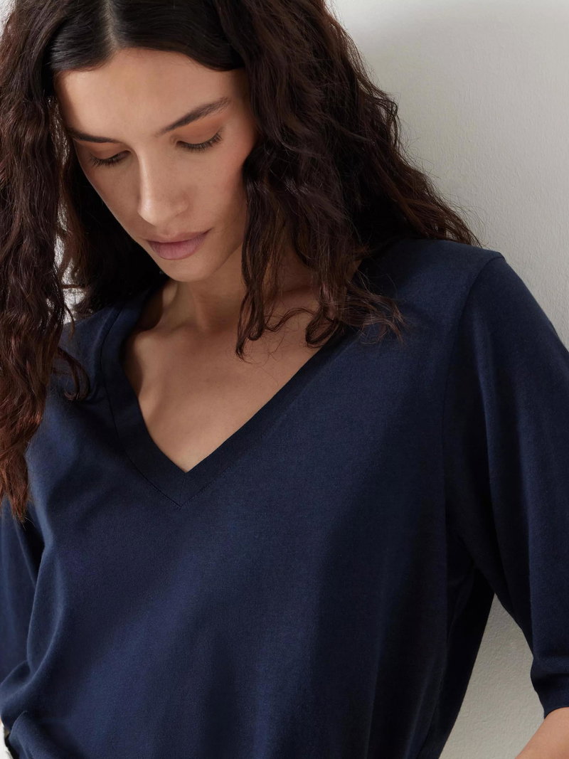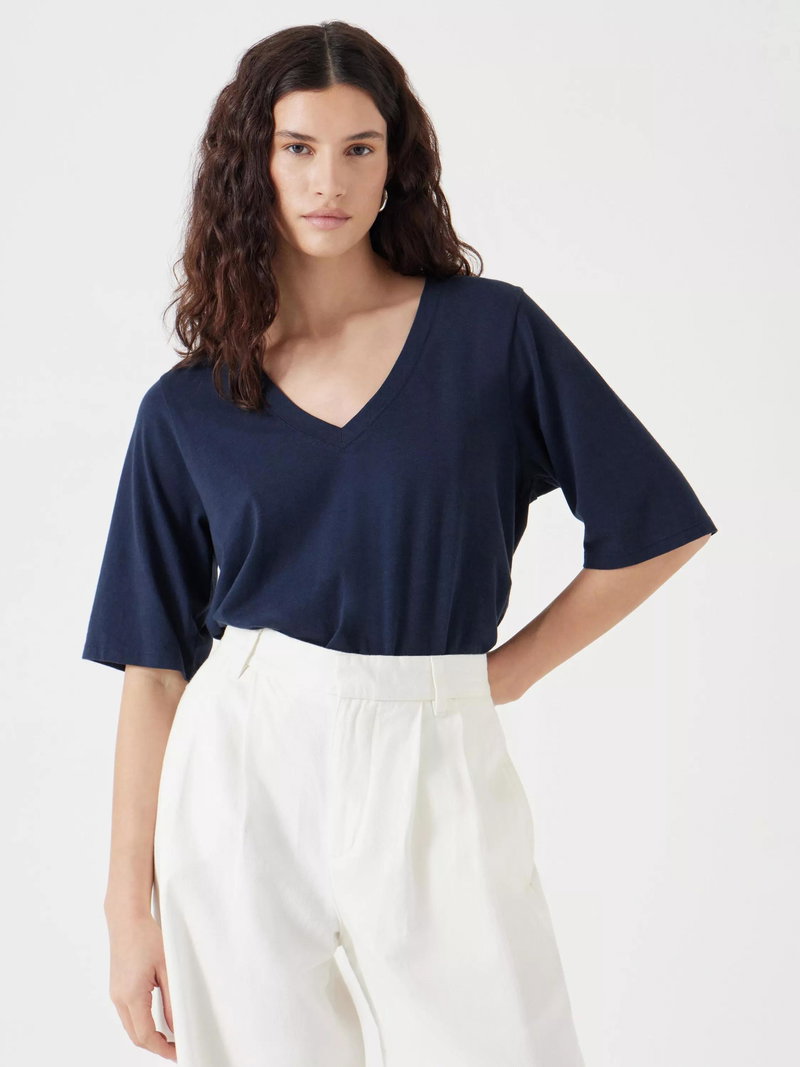 A draped easy-fit T-shirt from HUSH, made from a comfortable cotton-rich fabric. Featuring a V-neck and elbow length sleeves, the plain design means it goes with everything. A wear-everywhere essential.