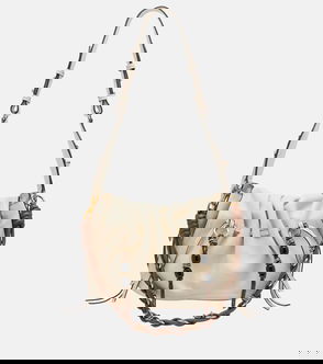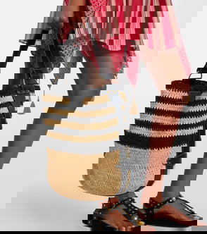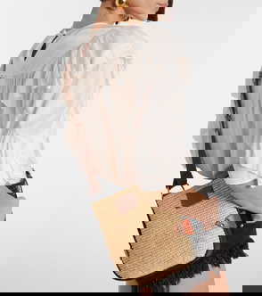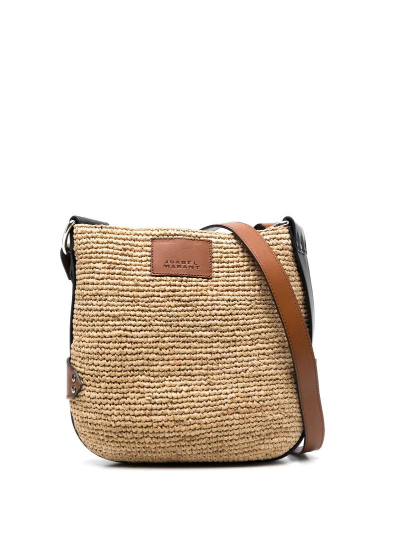 Beige/cognac brown calf leather/raffia woven raffia design logo patch to the front adjustable shoulder strap main compartment.