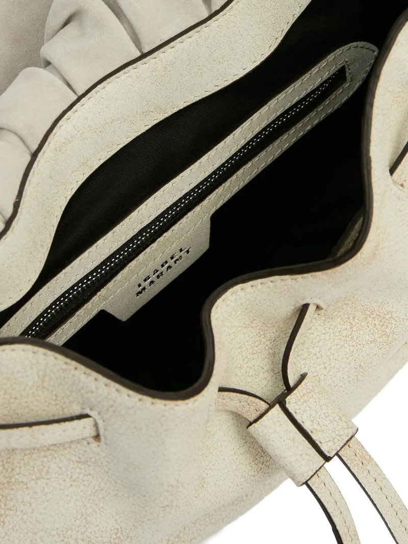 Beige, adjustable handle, magnetic flap fastening, leather straps, wooden bead charm, braided leather charm, internal zip pocket.