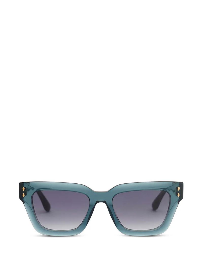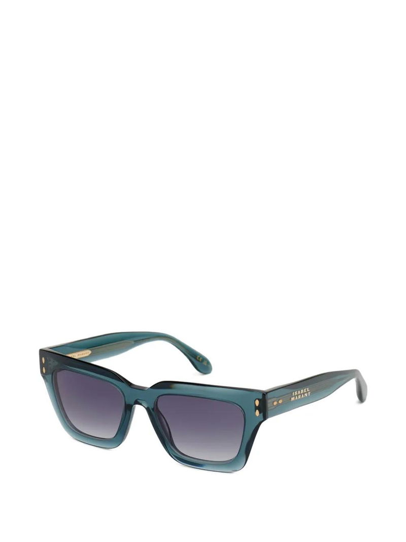 Blue, square frame, gradient lenses, full-rim design, nose pads, metal logo lettering.