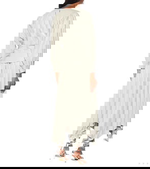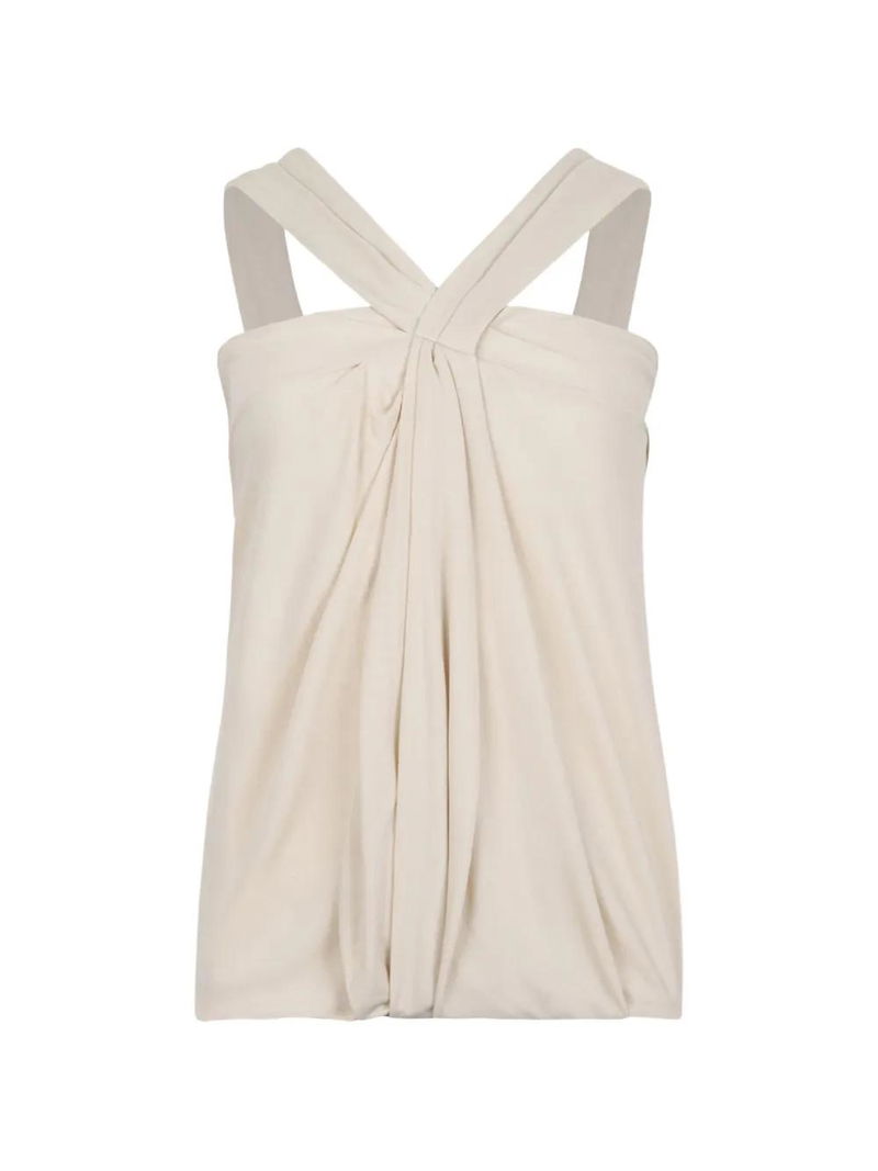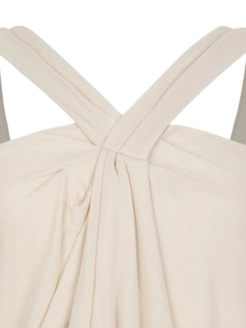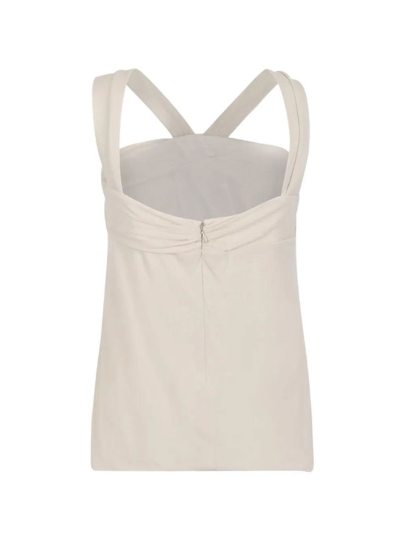 Beige crossover straps zip fastening draped design gathered detail.