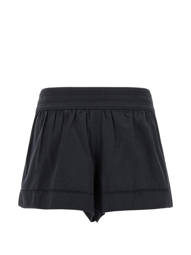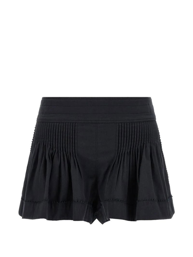 Black, front pleats, side zip closure pockets, waistband hem detail.