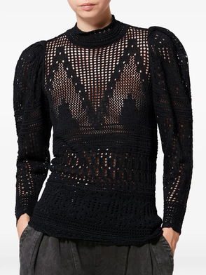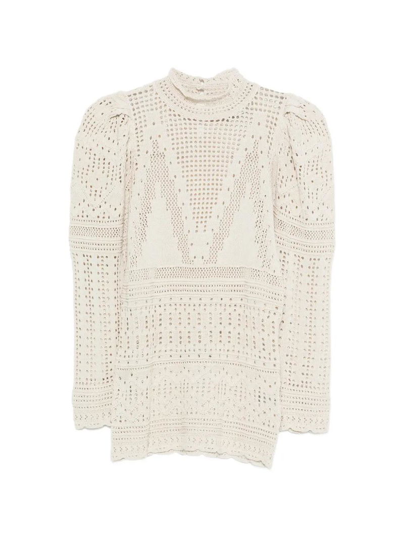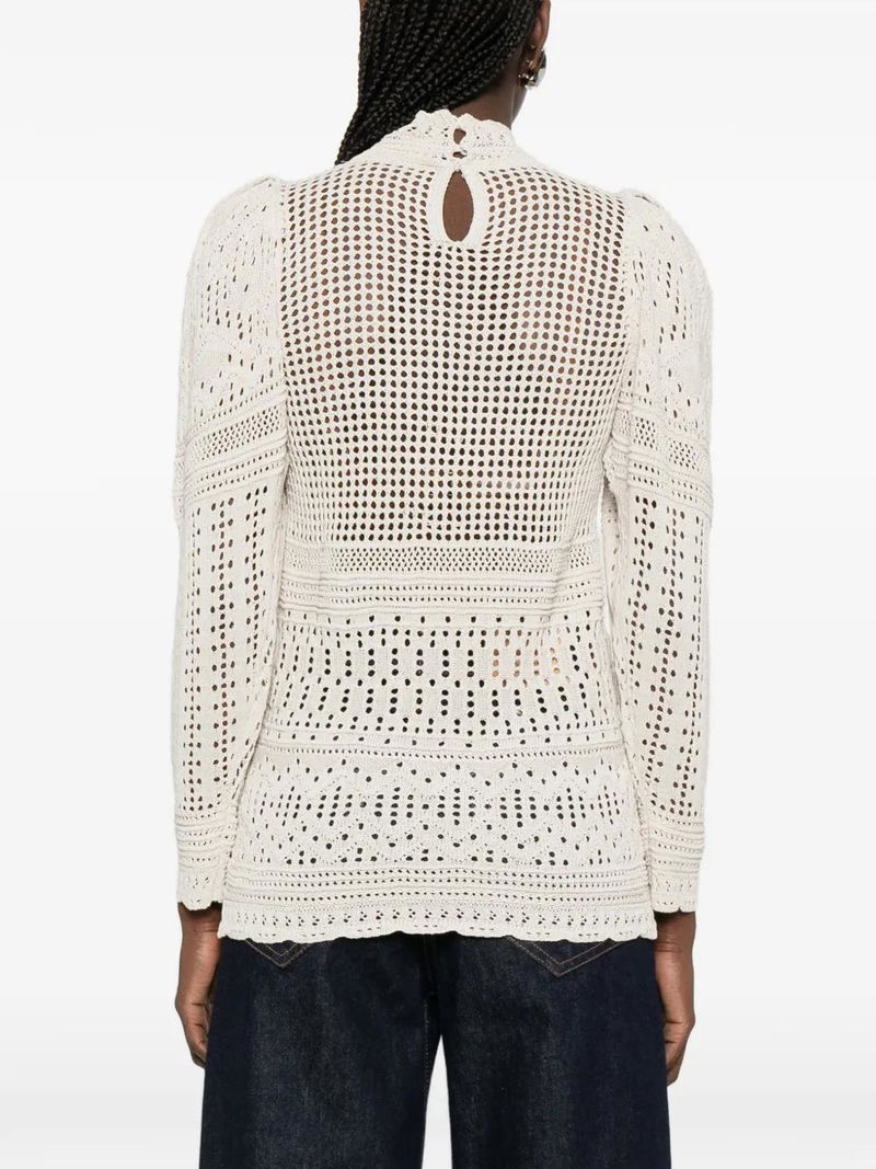 Light beige crochet knit high neck long sleeves geometric pattern open knit construction.