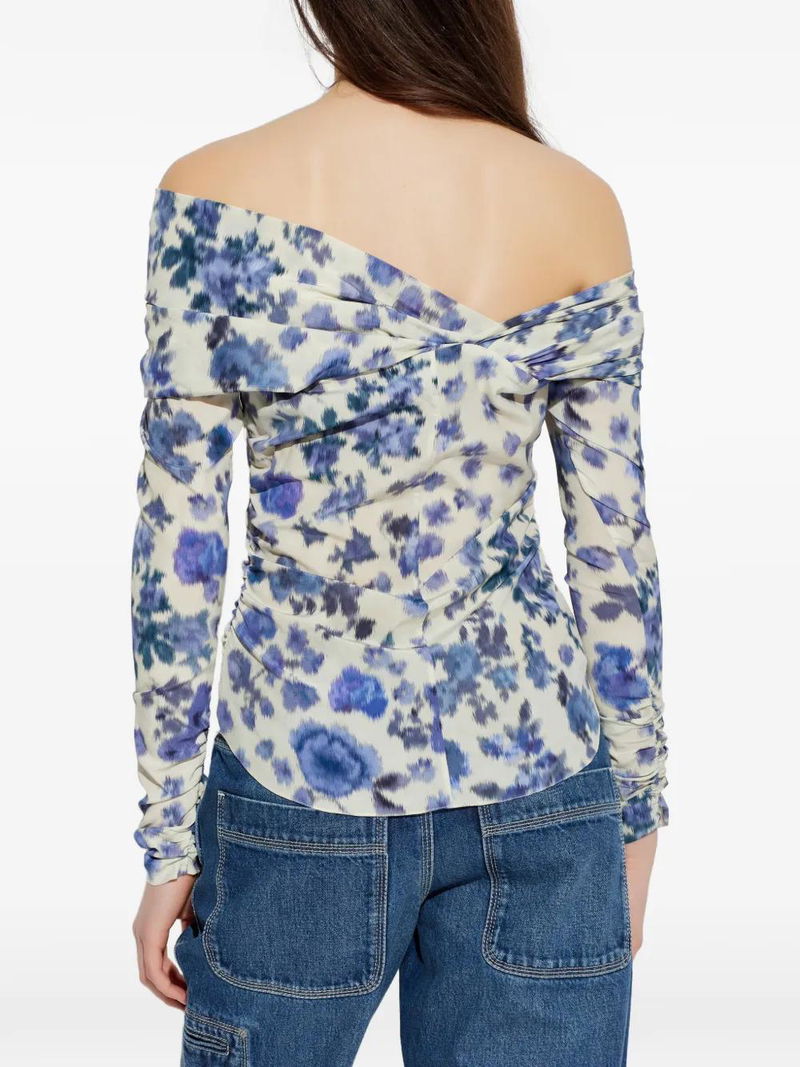 Ivory and blue floral print, gathered detailing, long sleeves, twisted front, off-shoulder.