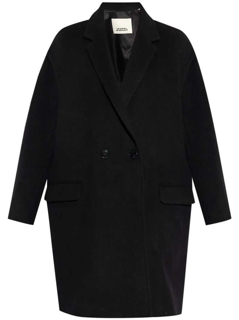 black wool-cashmere blend brushed finish notched lapels drop shoulder long sleeves two front flap pockets straight hem double-breasted button fastening
