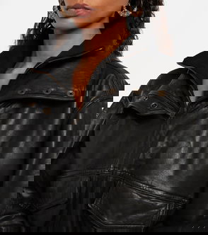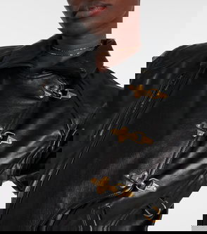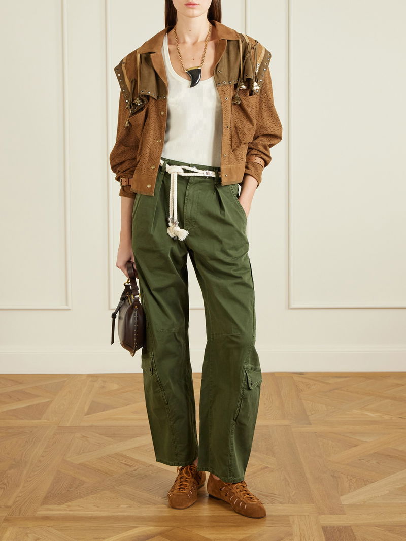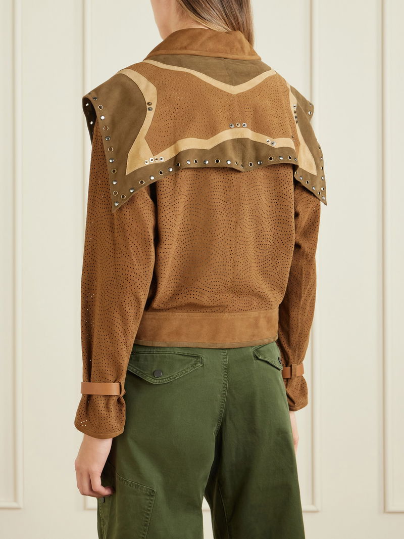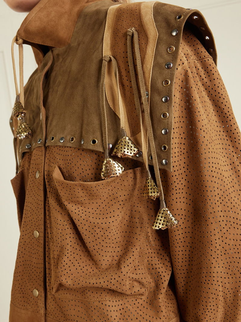 Isabel Marant’s 'Kayae' jacket is part of the brand's Spring '26 collection. Worn on the runway with tonal pants and a tank, it's made from perforated tan suede and embellished with studs and beaded tassels.