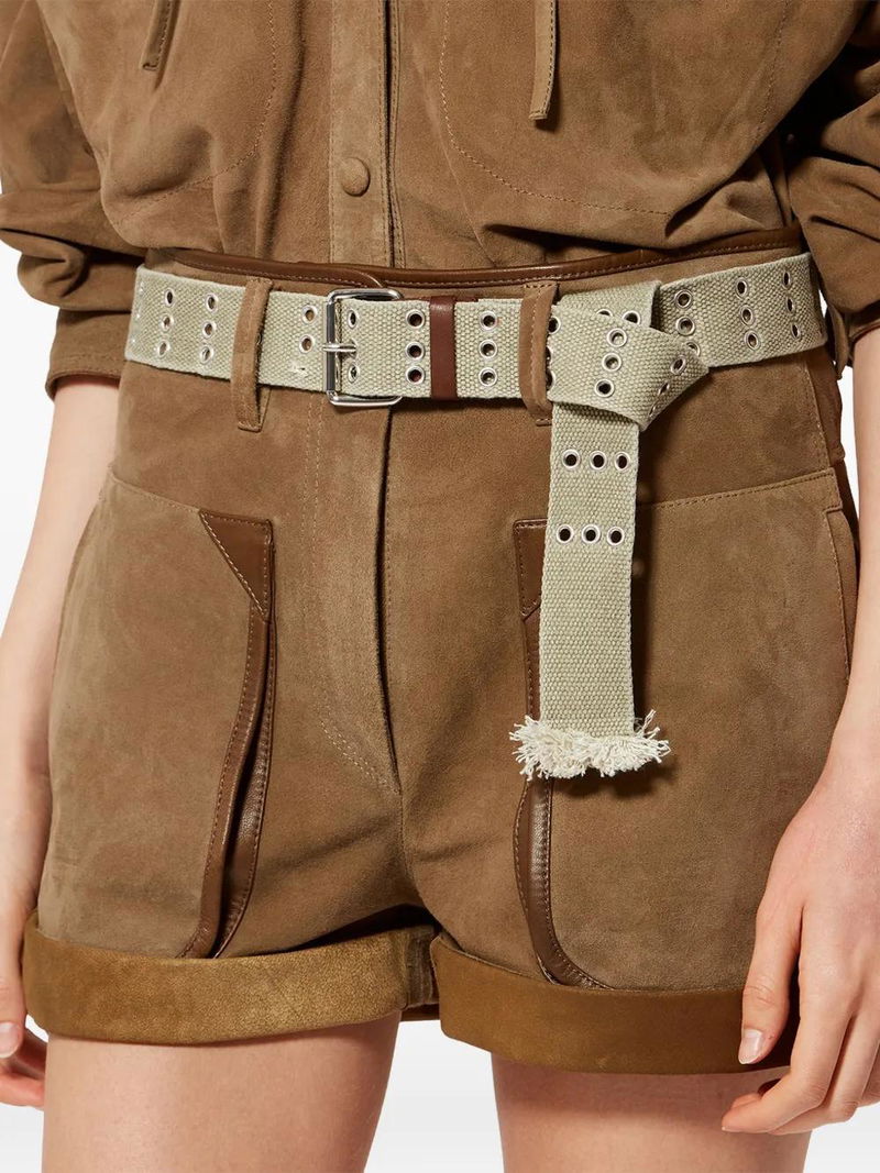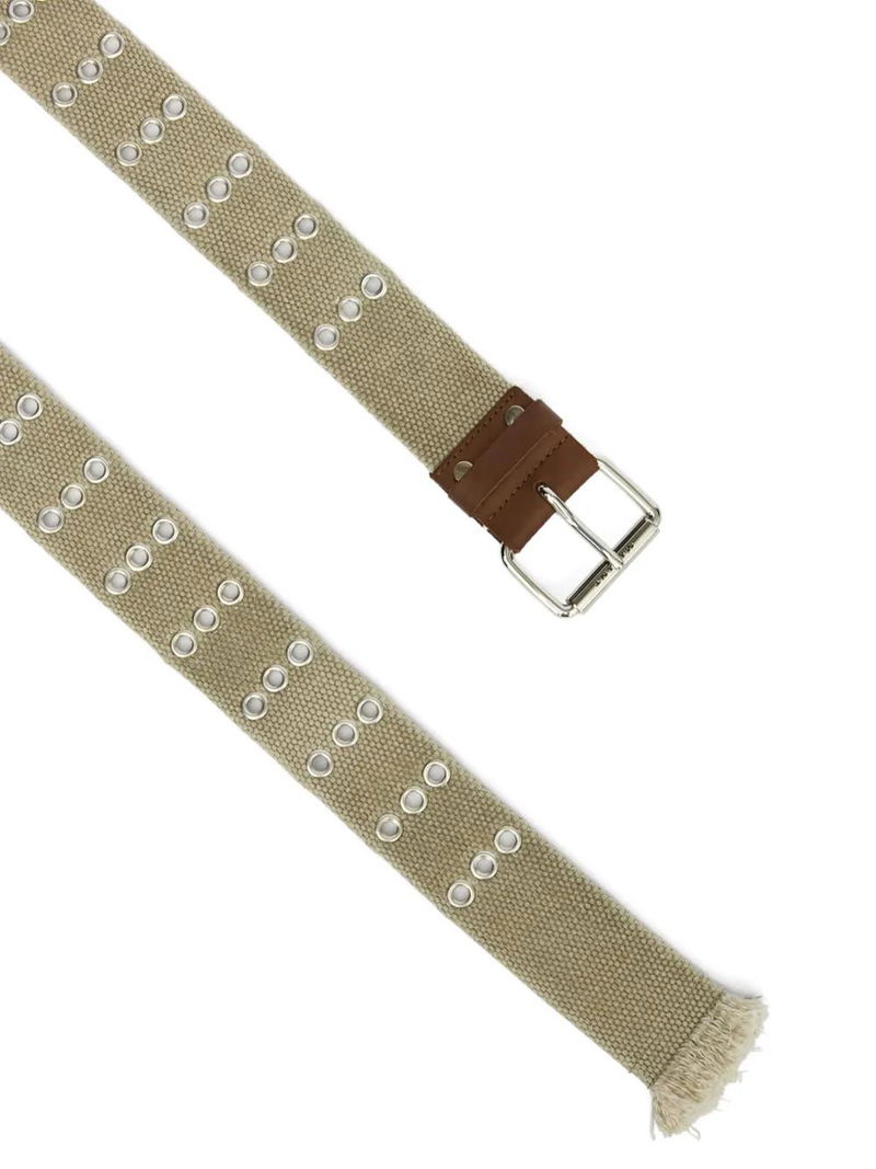 Beige cotton eyelets embellishment buckle fastening.