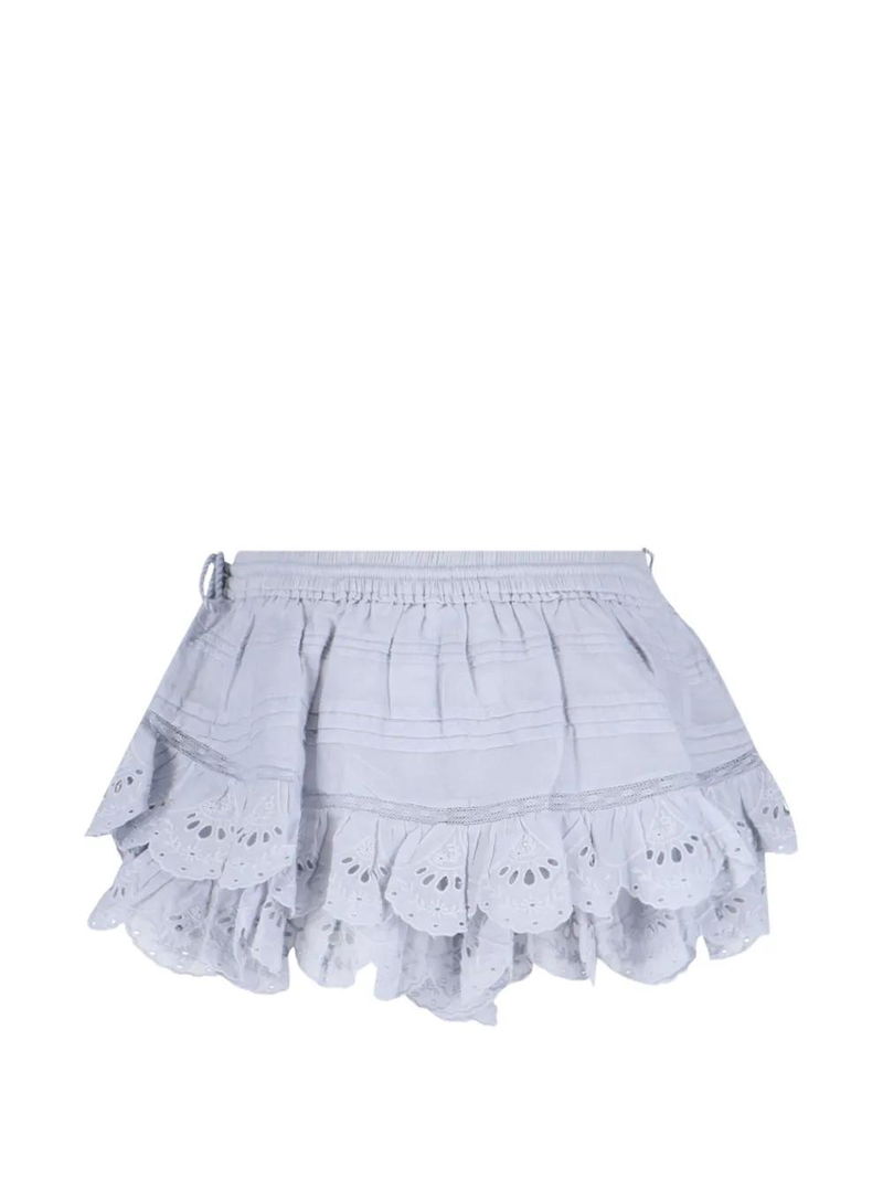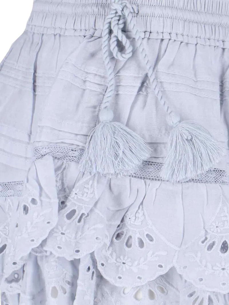 Light blue, tassel detail, elasticated waistband, ruffled trim, tiered design.